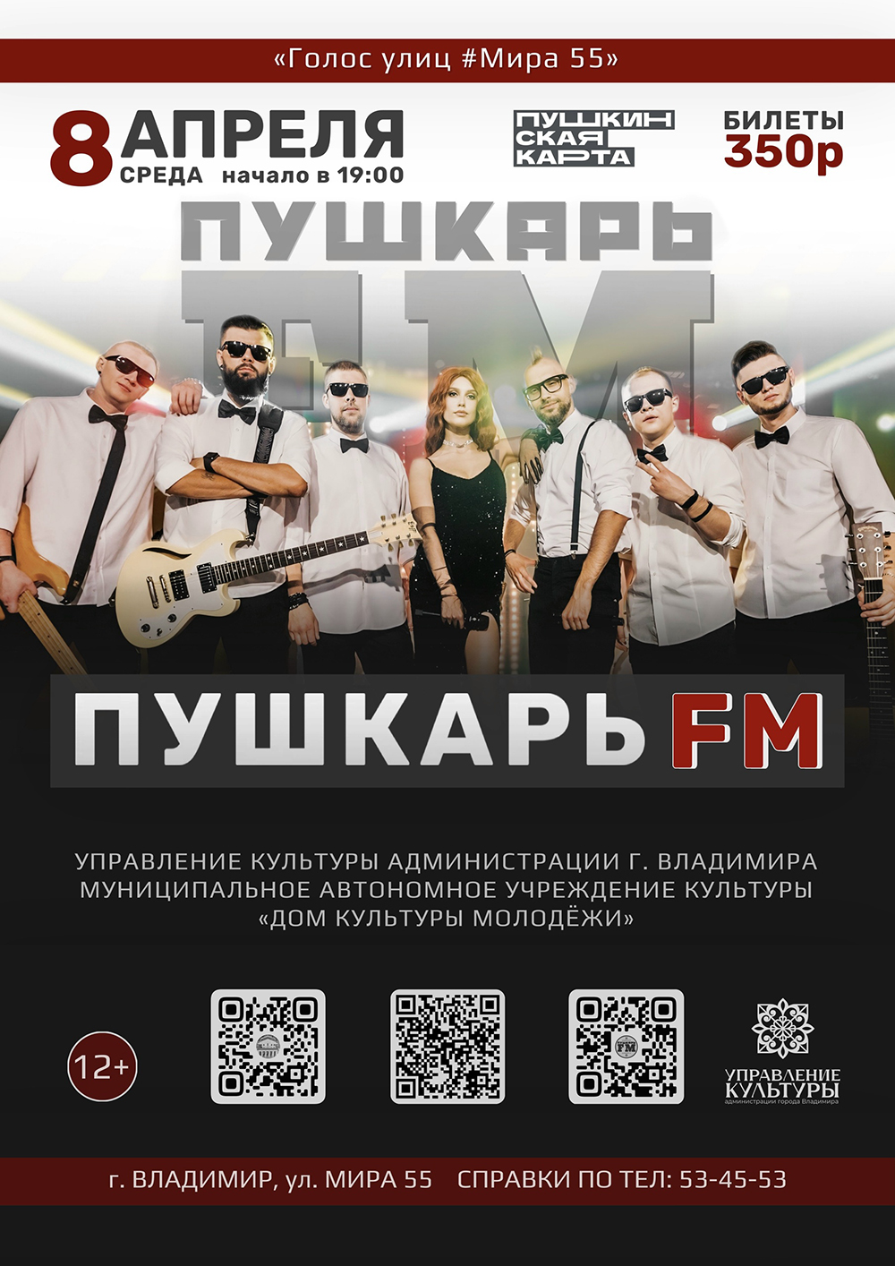 Концерты во Владимире Группа «ПушкарьFM»08 апреля 2026 в 19:00 Концерт «Голос улиц #Мира 55» «ПушкарьFM» – молодая, но уже достаточно известная кавер-группа в г. Владимире. В репертуаре кавер-группы присутствует определенная «стиляжная» направленность, деревянно-акустическая стилистика звучания... 8 апреля во главе с фронт-меном Андреем Трубиным, группа сыграет сольный концерт, в котором, прозвучат известные песни современных российских исполнителей, а так же, хиты прошлых лет. Проведите классный музыкальный вечер молодежно, весело, а главное вместе. Встречаемся в ДКМ на волнах «Пушкарь FM». Цена билета: 350 рублей Действует Пушкинская карта Билеты уже в продаже: https://quicktickets.ru/vladimir-dk-molodyozhi/s564 Дат: 08 апреля 2026 Начало: в 19.00 Место проведения: Дом культуры молодежи, концертный зал Адрес: г. Владимир, ул. Мира, д. 55 Информация с https://vk.ru/club51317454 « вернуться владимирская афиша другие концерты во Владимире |