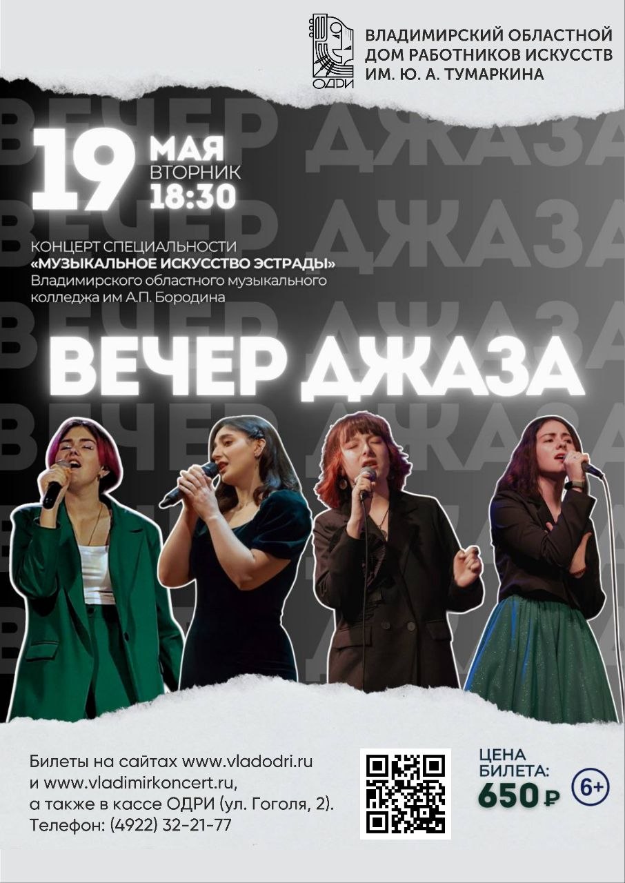 Концерты во Владимире «Вечер джазовой музыки»19 мая 2026 в 18:30 19 мая в областном Доме работников искусств состоится традиционный концерт отделения «Музыкальное искусство эстрады» Владимирского областного музыкального колледжа им. А. П. Бородина, приуроченный ко дню рождения Николая Грунского. В уютной атмосфере камерного зала ОДРИ в исполнении студентов и преподавателей зрители смогут услышать музыку различных джазовых и околоджазовых направлений. Ведущая вечера — Людмила Семёнова расскажет о стилях современной музыки и о том, как зарождался джаз во Владимире, коснётся истории отделения «Музыкальное искусство эстрады», исполнители порадуют яркими номерами. «Вечер джазовой музыки» – это не только подведение итогов года, но и вечер памяти великих педагогов, благодаря которым во Владимире зародился и развивается джаз: Н. Грунского, Ю. Воронова, Н. Пахомова, П. Федорова. В концерте принимают участие их ученики и последователи – люди, перенявшие традиции и бережно передающие их из поколения в поколение. Цена билета: 650 руб. Билеты в кассе ОДРИ. Дата: 19 мая 2026 Начало: в 18.30 Место проведения: Владимирский областной Дом работников искусств Адрес: г. Владимир, ул. Гоголя, 2 Информация с https://vladodri.ru/events/vecher-dzhazovoj-muzyki-2/ « вернуться владимирская афиша другие концерты во Владимире |