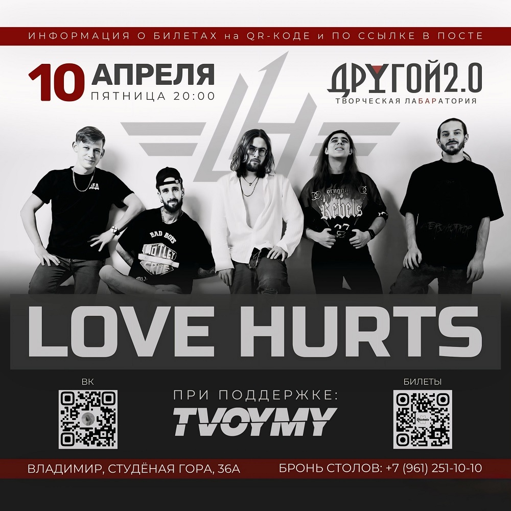 Концерты во Владимире Сольный Концерт Love Hurts10 апреля 2026 в 20:00 Группа Love Hurts даёт первый с 2024 года полный электрический концерт. Для вас прозвучат новые авторские песни в обновлённом составе Готовьтесь к плотному звуку, искренней энергетике и полному погружению в мир альтернативного рока от Love Hurts Купить билеты: https://qtickets.ru/event/217605?base_color=17b35d Дата: 10 апреля 2026 Начало: в 20.00 Место проведения: Другой Бар 2.0 Адрес: Владимир, ул. Студёная гора, 36А Информация с https://vk.com/concertlovehurts « вернуться владимирская афиша другие концерты во Владимире |