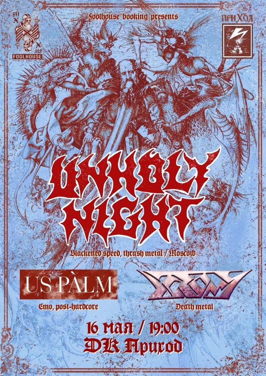 Концерты во Владимире Unholy Night, Us Palm, Ectomy16 мая 2026 в 19:00 Готовьте ваши барабанные перепонки и разминайте свои бренные тела потому, что 16 мая во Владимир гонит великий трэш метал десант UNHOLY NIGHT!!! Вход: 1000 руб. Дата: 16 мая 2026 Начало: в 19.00 Место проведения: ДК ПРИХОД Адрес: г. Владимир, ул. Луначарского, д. 3и Информация с https://vk.ru/unholynightvld26 « вернуться владимирская афиша другие концерты во Владимире |