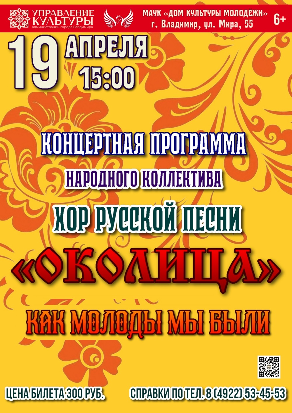 Концерты во Владимире Концерт Народного коллектива Хора русской песни «ОКОЛИЦА»19 апреля 2026 в 15:00 «ДОМ КУЛЬТУРЫ МОЛОДЁЖИ» приглашает на концерт Народного коллектива Хор русской песни «ОКОЛИЦА». Вас ждет душевный и разнообразный репертуар: лирические песни о Родине и семье, задушевные посвящения зрителям и, безусловно, гимн бесконечной любви к русской песне. В программе прозвучат любимые народом жанры: задорные свадебные и величальные, озорные шуточные и плясовые, а также широкие хороводные и игровые песни. Украшением вечера станут выступления специальной гостьи: - Гармонистка Екатерина Миронова (неоднократная участница легендарной телепередачи «Играй, гармонь!»), виртуозно владеющая русской гармошкой. Этот вечер – возможность всем сердцем ощутить тепло и силу народной песни, которая говорит о самом важном. Ждем всех любителей русского фольклора! Русской песни! Русского веселья! Цена билета: 300 рублей Билеты уже в продаже: https://quicktickets.ru/vladimir-dk-molodyozhi/s565 Дата: 19 апреля 2026 Начало: в 15.00 Место проведения: Дом культуры молодежи, концертный зал Адрес: г. Владимир, ул. Мира, 55 Информация с https://vk.ru/wall-51317454_10977 « вернуться владимирская афиша другие концерты во Владимире |