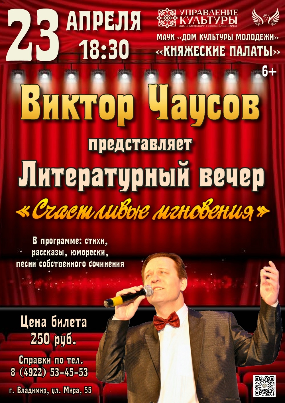 Концерты во Владимире Авторский литературный вечер «Счастливые мгновения» Виктора Чаусова23 апреля 2026 в 18:30 «ДОМ КУЛЬТУРЫ МОЛОДЁЖИ» приглашает на Авторский литературный вечер «Счастливые мгновения» Виктора Чаусова. Виктор Николаевич Чаусов – многогранная творческая личность. Многие жители города Владимира знают его как великолепного певца советской эстрады и оперетты. А еще – это поэт, автор песен, декламатор, интересный собеседник и великолепный конферансье. Эти качества неоднократно были отмечены высшими наградами различных творческих конкурсов. И, как настоящий артист, свой день рождения празднует на сцене, разделяя радость праздника с любимыми зрителями. В тёплый апрельский вечер под сенью уютных «Княжеских палат» в дружеской атмосфере вы услышите стихи, рассказы, юморески, песни собственного сочинения Виктора Николаевича. Цена билета: 250 рублей Билеты уже в продаже: https://quicktickets.ru/vladimir-dk-molodyozhi/s570 Дата: 23 апреля 2026 Начало: в 18.30 Место проведения: Дом культуры молодёжи, зал «Княжеские палаты» Адрес: г. Владимир, ул. Мира, 55Информация с https://vk.ru/wall-51317454_11001 « вернуться владимирская афиша другие концерты во Владимире |
