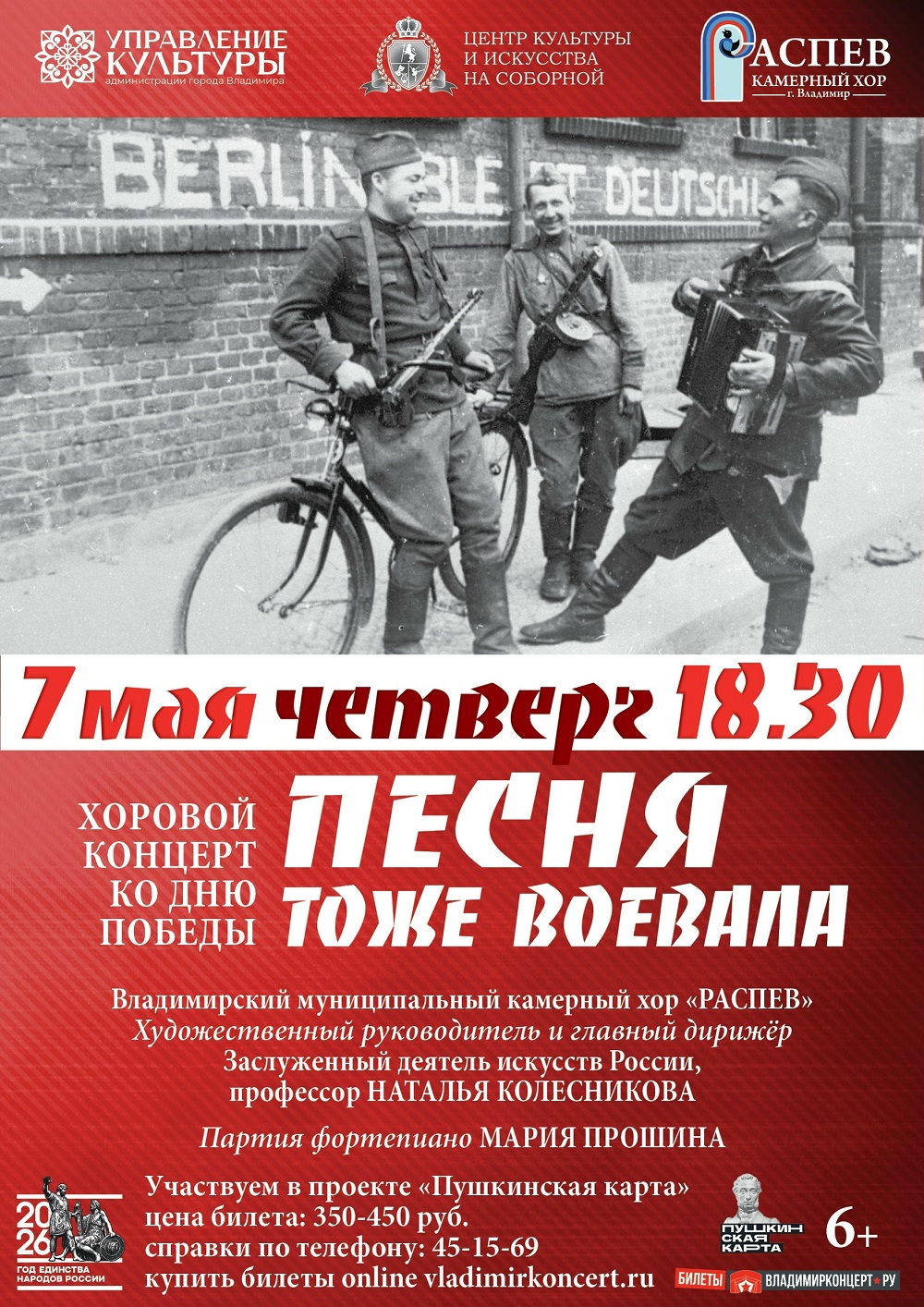 Концерты во Владимире Концерт «Песня тоже воевала»07 мая 2026 в 18:30 "Кто сказал, что надо бросить песни на войне? - После боя сердце просит музыки вдвойне!" 7 мая в Большом зале Центра культуры и искусства на Соборной будут звучать песни военных лет. Полноправный боец в годы Великой Отечественной, а иной раз и главнокомандующий - песня. "Вставай, страна огромная!" - как глас самой Родины, призывающий своих сынов, вселяющий невероятную силу и веру. С песней легче решались на смертный бой и уходили в неизвестность. Она шагала в кирзовых сапогах по бесконечным пыльным дорогам войны, согревая сердца солдат. "Жди меня, и я вернусь", - огрызками карандаша писали на крохотных клочках бумаги и хранили у самой груди, в карманах гимнастёрок, рядом с фотографиями любимых и родных. Свято верили - дома ждут и верят в Победу. "Как я выжил будем знать только мы с тобой", - эту веру вселяла тоже песня! Песня прилетала материнской любовью в майских трелях соловья, воспоминанием о любимой, что как и прежде ждёт у ворот родного сердцу дома. Песня воспевала героев в камне, что и по сей день стоят в чужих землях, не давала кануть в забвение именам павших друзей-однополчан. Она выстрадана судьбами, потерями, надеждами Н. Богословского и М. Исаковского, А. Александрова и М. Блантера, А. Фатьянова и Р. Гамзатова, А. Чуркина и Б. Окуджавы. Такая она, советская песня, песня страшных военных лет. Великая и трепетная, мощная и нежная, правдивая, родная. Настоящая. Сегодня она - классика, незабвенный пласт культуры нашей страны, родившийся самой историей Великой Отечественной Войны. Билеты по ссылке: https://vladimirkoncert.ru/shows/event/11009-Kontsert-Pesnya-tozhe-voevala Дата: 07 мая 2026 Начало: в 18.30 Место проведения: Центр культуры и искусства на Соборной Адрес: г. Владимир, Большая Московская ул., 33/35 Информация с https://vk.ru/wall-30929449_5291 « вернуться владимирская афиша другие концерты во Владимире |