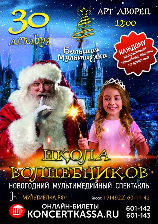Представления во ВладимиреШоу «МультиЁлка. Школа волшебников»30 декабря 2018 в 12:00 Новогоднее представление Приглашаем вас окунуться в волшебную атмосферу сказки – мультимедийное шоу «МультиЁлка. Школа волшебников» – новогоднее чудо начинается! Начало: 30 декабря в 12:00 Место: Арт-Дворец, ул. Северная, 2а Стоимость билетов от 650 рублей. Дети до 3 лет включительно – вход бесплатный. На шоу «МультиЁлка. Школа волшебников» вас ждет: - увлекательное путешествие на огромном мультимедийном экране, где каждый зритель станет настоящим волшебником - интерактивная волшебная палочка для каждого зрителя - новогодние сказочные фотозоны, где можно бесплатно сделать волшебные фотографии - аттракционы виртуальной реальности (VR) - беспроигрышная лотерея МультиЁлка – это уникальный мультимедийный новогодний спектакль, где зрители попадут в школу магии, смогут перемещаться во времени и управлять природными явлениями, изучать заклинания и спасать один из главных символов Нового Года – волшебный посох Деда Мороза. НАШИ КАССЫ: 1. Областной Дворец культуры и искусства Телефон: +7 (4922) 54-38-88 Режим работы: пн.-пт. с 11.00 до 19.00, сб. с 11.00 до 16.00, вс. выходной 2. Кинотеатр "РУСЬКИНО" Суздальский пр., 8 Телефон для справок: 400-004 Режим работы: 3. ТЦ "Восток-1" ул. Егорова, 8Б, центральный вход, 1 этаж, рядом с "АШАН" Телефон: 8(4922)601-143 пн.-пт. с 10.00 до 19.00 сб.-вс. с 10.00 до 14.00. 4. Магазин "КВАРТАЛ" пр. Ленина, 3, напротив гостиницы "ЗАРЯ" Режим работы: пн. с 11.00 до 17.30 вт.-пт. с 09.00 до 17.30 сб. с 09.00 до 14.00 вс. выходной 5. ул. Нижняя Дуброва, 34а, напротив рынка "Слобода", у магазина "У Палыча" График работы кассы: пн.-пт. с 10.00 до 19.00 сб. с 10.00 до 14.00 вс. выходной Телефон кассы: 8(900)473-94-61 6. ДК Молодёжи ул. Мира, 55 пн.-пт. с 09.00 до 17.30 сб.-вс. выходной 7.Рынок "На Чайковского" ул. Чайковского, 3, киоск "СПОРТЛОТО" Режим работы: сб.-вс с 10.00 до 15.00 8. Рынок "Славянский базар" ул. Батурина, 28В, киоск "СПОРТЛОТО", напротив ледового дворца "Полярис" Режим работы: пн.-пт. с 09.00 до 19.00 9. Арт-Дворец ул. Северная, 2А, вход с левой стороны здания (ВРЕМЕННО НЕ РАБОТАЕТ) Режим работы: пн.-сб. с 14.00 до 19.00 вс. выходной Информация с https://vk.com/event171989573 « вернуться владимирская афиша |