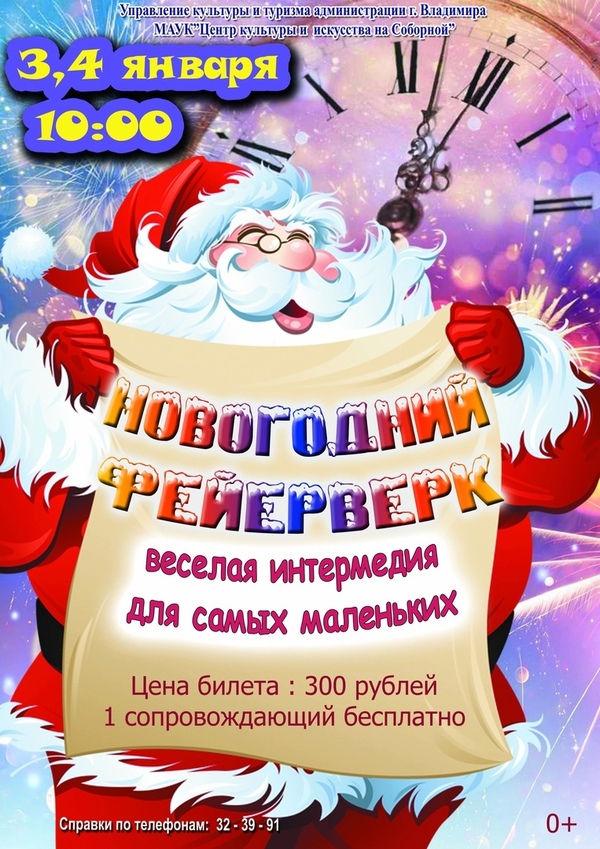 Представления во ВладимиреВеселая интермедия для малышей «Новогодний фейерверк» (0+)03 января 2020 в 10:00 Новогоднее представление для самых маленьких В дни новогодних каникул «Центр культуры и искусства на Соборной» приглашает родителей и их малышей на веселую интермедию «Новогодний фейерверк». Ждем вас 3 и 4 января, в 10.00, в «Центре культуры и искусства на Соборной», по адресу: г. Владимир, Большая Московская ул., д. 33/35 Цена билета 300 рублей. Телефон для справок: 32-39-91, 32-37-32 Информация с https://vk.com/centrnasobornoy?w=wall-45749277_1078%2Fall « вернуться владимирская афиша |