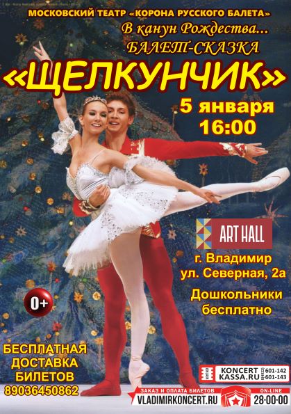 5 января 2020 года, в городе Владимир, на концертной площадке «ART HALL» (ул. Северная, 2А) состоится балет «ЩЕЛКУНЧИК». После представления детей ждет хоровод у Ёлки с Дедом Морозом и Снегурочкой.