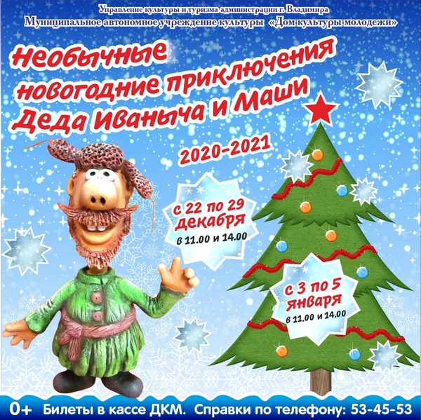 Представления во ВладимиреНовогоднее представление «Необычные новогодние приключения Деда Иваныча и Маши!» (0+)22 декабря 2020 в 11:00 Вы уже решили, КУДА пойдете с малышом ЗА НОВОГОДНИМ ЧУДОМ? Мы ПРИГЛАШАЕМ, приходите к нам!Захватывающее новогоднее шоу, главными героями которого станут мудрый Дед Иваныч и непослушная Маша, настоящая искательница приключений, перенесет зрителей в волшебные миры различных сказок! Что ожидает Деда Иваныча и девочку Машу? Кто станет верным помощником в их путешествии? А главное, чем закончится это увлекательное путешествие? Ответы на все эти вопросы Вы сможете узнать в Доме Культуры Молодежи, купив билеты на новогоднее представление «Необычные новогодние приключения Деда Иваныча и Маши!». В этом году мы хотим удивить нашего зрителя техническими новинками, авторскими костюмами, ну и конечно всех зрители гарантированно попадут в настоящую сказочную Новогоднюю атмосферу! Еще одним приятным предложением от Дома Культуры Молодежи станет то, что Вы покупаете билет на новогоднее представление ТОЛЬКО РЕБЕНКУ! ДА! Сопровождающий взрослый идет БЕСПЛАТНО! Новогоднее представление в Доме Культуры Молодежи подойдет для детей всех возрастов! Начало представлений: с 22 по 29 декабря 2020 года в 11.00 и 14.00 с 3 по 5 января 2021 года в 11.00 и 14.00 Билеты в кассе ДКМ. Адрес: ул. Мира, 55 Справки по телефону: 53-45-53 Информация с https://vk.com/dkmvladimir?w=wall-51317454_2982 « вернуться владимирская афиша |