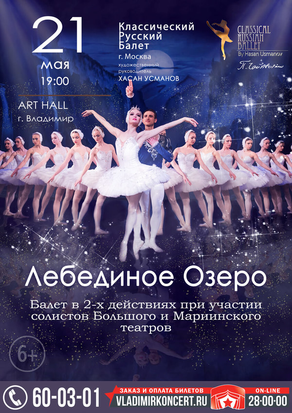 Представления во ВладимиреБалет "Лебединое озеро" (6+)21 мая 2021 в 19:00 Московский Классический Русский Балет "Лебединое Озеро" под Руководством Хасана Усманова (при участии солистов Большого и Мариинского театров).Балет в двух актах, четырех картинах Музыка Петра Ильича Чайковского Хореография Мариуса Петипа, Льва Иванова в редакции Хасана Усманова При участии: Прима-Балерина Елизавета ТарандаВедущий солист Сергей Скворцов Заслуженная Артистка России, Прима-Балерина Наталья КунгурцеваО театре: «Классический Русский балет» - молодая, но успешная московская труппа классического танца. Компания была основана в 2004 году, но за семнадцать лет своей активной творческой жизни зарекомендовала себя как профессиональный развивающийся коллектив, в который вошли лучшие представители балетных школ России, талантливая перспективная молодежь и зрелые заслуженные мастера танца. Основу балетной труппы на сегодняшний день составляют выпускники Московской академии хореографии, Академии русского балета имени А.Я. Вагановой (Санкт-Петербург) и других известных балетных школ России. В формировании коллектива Классического Русского балета принял участие его художественный руководитель, солист театра Хасан Усманов.Классический Русский балет , помимо выступлений на столичных сценах, активно гастролирует по России и за рубежом. Спектакли Классического Русского балета с успехом были встречены зрителями Екатеринбурга, Киева, Одессы, а также публика с воодушевлением принимала труппу в Финляндии, Японии, Испании, Израиле, Австрии, Германии, Греции и др. Краткое содержание: Действие первое Первая картинаВесеннее утро. На берегу озера Принц Зигфрид с друзьями и придворными веселятся и пируют. Появляется Владетельная Принцесса — мать Зигфрида в сопровождении свиты. Она напоминает Принцу о том, что наступил последний день его холостой жизни — завтра совершеннолетие, и он должен выбрать себе невесту. Владетельная Принцесса представляет Зигфриду двух девушек-невест и предлагает ему выбрать одну из них. Принц в замешательстве, он не готов отдать сердце какой либо из девушек. Разочарованная Принцесса уходит вместе со своей свитой. Желая отвлечь Принца от неприятных мыслей, Шут с друзьями вовлекают его в свой танец. Но Принц хочет остаться один. Что-то влечет его к озеру, он устремляется туда. Вторая картина По озеру проплывает стая лебедей. Принц с удивлением видит, что лебеди превращаются в девушек. Королева лебедей Одетта рассказывает Принцу о том, что она и ее подруги — жертвы злого колдовства волшебника Ротбарта, который превратил их в лебедей. Только ночью, возле этого озера, они могут принимать человеческий облик. Зигфрид очарован красотой Одетты, он клянется ей в вечной любви и верности. Занимается заря. Одетта прощается со своим возлюбленным. Действие второе Третья картина В замке Владетельной Принцессы — большой бал, посвященный совершеннолетию Принца. На этом балу, согласно воле матери, Зигфрид должен окончательно выбрать себе невесту. Появляются гости, проходят невесты со свитой. Невесты танцуют. Принц танцует с невестами. Мать снова просит Зигфрида сделать выбор. Он колеблется. Внезапно появляется неизвестный рыцарь с красавицей дочерью Одиллией. Сходство ее с Одеттой смущает Принца. Увлеченный ее красотой, он ничего не замечает в