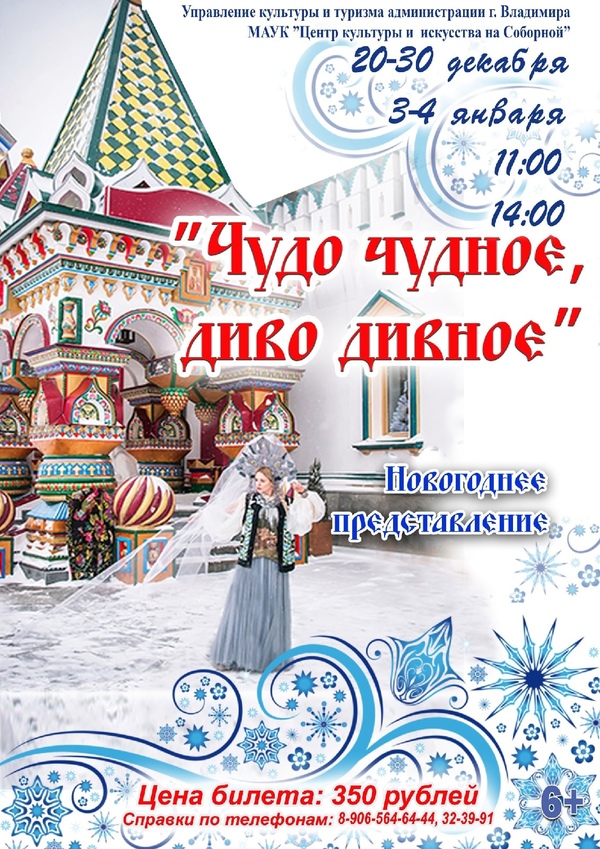 В канун Нового года и в праздничные дни «Центр культуры и искусства на Соборной» приглашает всех на Новогоднее представление «Чудо чудное, диво дивное». Эта история о любви, дружбе, добре и настоящем чуде.