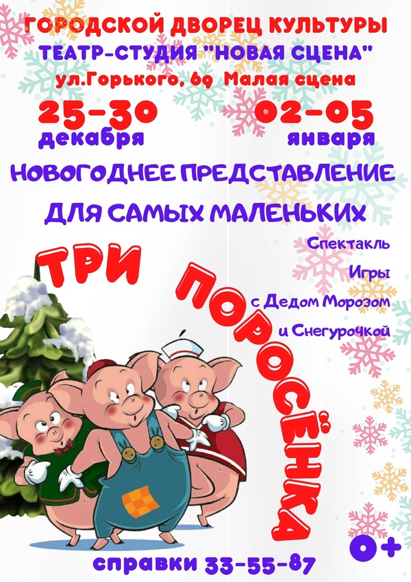 Представления во ВладимиреИнтерактивный спектакль "ТРИ ПОРОСЕНКА" (0+)02 января 2022 в 00:00 Новогоднее представление Новый год для самых маленьких! ИНТЕРАКТИВНЫЙ СПЕКТАКЛЬ "ТРИ ПОРОСЕНКА". Поучительная, любимая многими поколениями сказка.Продолжительность интерактивного спектакля - 20-25 мин. ПОЗДРАВЛЕНИЯ ДЕДУШКИ МОРОЗА. У нас Дед Мороз весьма "возрастной"- лет ему более 500-та - потому нешумный, спокойный, размеренный и очень добрый. С удовольствием поиграет в зимние игры со всем залом. КОНКУРСЫ ОТ СНЕГУРОЧКИ. Эта ледяная красавица научит всех зрителей - от мала до велика - новым веселым незатейливым песенкам)Продолжительность поздравления Деда Мороза и Снегурочки (15-20 мин). Итак, спектакль "Три Поросенка", поздравления от Деда Мороза и Снегурочки, игровая программа - для самых маленьких наших зрителей. Напоминаем, что малышей и их родителей мы ждем на Малой сцене (ул. Горького, 69). Для взрослых обязателен QR-код. Билеты в кассе ГДК с 1 декабря 2021. Все справки по тел.: 33-55-87 Даты: 25-30 декабря 2021 года 2-5 января 2022 года « вернуться владимирская афиша |