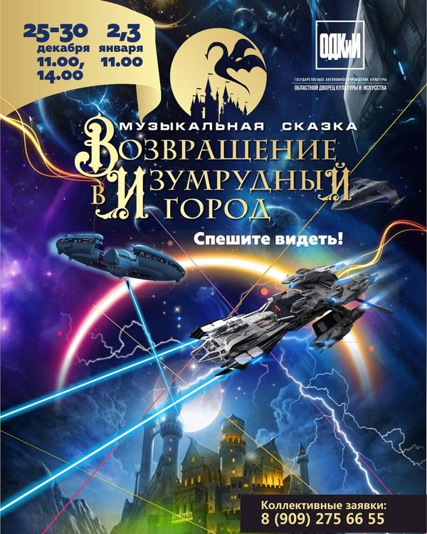 Представления во ВладимиреМузыкальная сказка "Возвращение в Изумрудный город"02 января 2022 в 11:00 Доступно по программе "ПУШКИНСКАЯ КАРТА" «Возвращение в Изумрудный город» — это красочное мультимедийное шоу с захватывающим сюжетом, песнями, танцами, цирковыми трюками и light-show, яркими персонажами, веселыми играми со зрителем, где всегда есть место чуду! В основе сюжета спектакля повести известного советского и российского писателя Александра Волкова «Тайна заброшенного замка» и «Желтый туман». Творчество писателя давно полюбилось детям. Героев произведений «Волшебник Изумрудного города», «Урфин Джюс и его деревянные солдаты», «Тайна подземных королей» и др. хорошо знают и дети, и взрослые. Цена: 500 руб. Дата: 25-30 декабря 2021 года в 11.00 и 14.00 Информация с http://odk33.ru/afisha/?news=7362, 3 января 2022 года в 11.00 Место: Областной Дворец культуры и искусства Адрес: г. Владимир, ул. Диктора Левитана, 4 Билеты в кассе ОДКиИ (54-38-88) Коллективные заявки: 8 (909) 275-66-55 « вернуться владимирская афиша |