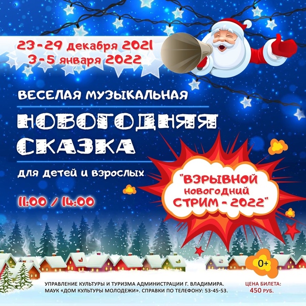Представления во ВладимиреНовогодняя сказка «Взрывной новогодний стрим 2022» (0+)23 декабря 2021 в 11:00 В этом году "Дом Культуры Молодежи" превратиться в платформу, на которой, в режиме реального времени, пройдет самый «Взрывной новогодний стрим 2022». Всем же интересно, что он делает, в то время, когда не занят раздачей подарков. И…Кто мешает ему? Как? Зачем? И почему? Цена билета: 450 руб. Дата: с 23.12.2021 по 29.12.2021 с 03.01.2022 по 05.01. 2022 Время: 11.00 и 14.00 Место: Дом культуры молодежи Адрес: г. Владимир, ул. Мира, д. 55 Справки по телефону: +7 (4922) 53-12-65, +7 (4922) 53-45-53 « вернуться владимирская афиша |
