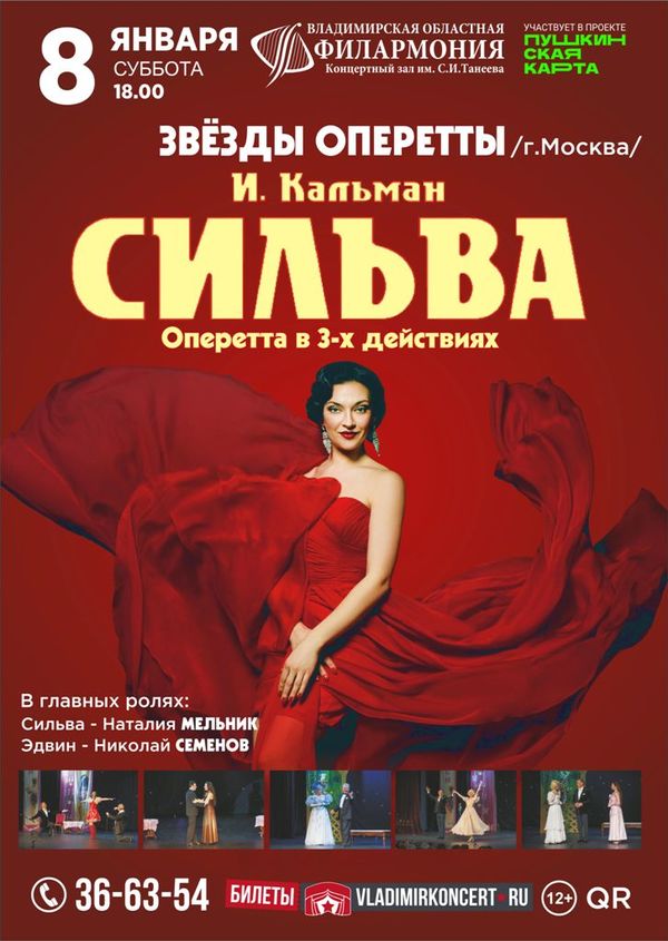 Представления во ВладимиреОперетта «СИЛЬВА» (12+)08 января 2022 в 18:00 «Сильва» – знаменитое произведение венгерского композитора Имре Кальмана, написанное им в 1915 году. Премьера с необыкновенным успехом прошла в Вене. Оперетта по праву считается вершиной творчества композитора, сочетая в себе лучшие составляющие этого жанра – великолепная музыка, выразительные арии, яркие хореографические сцены и захватывающий сюжет с феерическим финалом. Классическую музыкальную историю о всепобеждающей силе любви, которой не страшны никакие преграды, представят актеры театра «Московская оперетта».Сильва Вареску — талантливая и трудолюбивая, становится звездой Будапештского варьете. Сильва любит молодого аристократа Эдвина, но их брак невозможен из-за социального неравенства. Однако гости кабаре, как и зрители спектакля, верят, что влюблённые обретут счастье вопреки обстоятельствам. Продолжительность: 2 часа 20 минут с 1-м антрактом Цена билета: 800-1400 руб. Участвует в проекте «Пушкинская карта» В главных ролях: Сильва - Наталия МЕЛЬНИК Эдвин - Николай СЕМЕНОВ Дата: 08 января 2022 года Начало: в 18.30 Место: Владимирская областная филармония Адрес: г. Владимир, проспект Ленина, дом 1 « вернуться владимирская афиша |