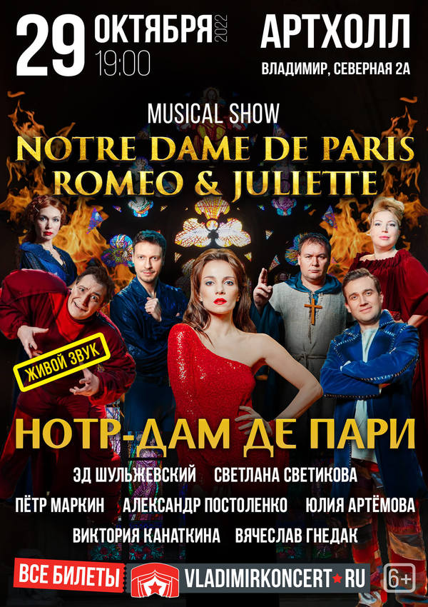Представления во ВладимиреМюзикл-шоу «NОTRE DAME DE PARIS». R&J29 октября 2022 в 19:00 Незабываемое шоу от звезд российских мюзиклов и актеров первого состава спектаклей «Нотр Дам де Пари», «Ромео и Джульетта», «Кабаре», «Три мушкетера» и т. д.Вы окунетесь в атмосферу древнего Парижа, потанцуете на его улицах вместе с цыганкой Эсмеральдой, познаете любовь и боль молодого горбуна, увидите предательство капитана Феба, станете свидетелями встречи Ромео и Джульетты, почувствуете беду от вражды Монтекки и Капулетти, пробежите по городу вместе с Королями Ночной Вероны… Атмосфера и эмоции великих мюзиклов не оставит вас равнодушными и запомнятся на всю жизнь, благодаря таланту прекрасных актеров-Светланы Светиковой, Эда Шульжевского, Петра Маркина, Александра Постоленко, Юлии Артемовой, Вячеслава Гнедака, Ольги Ворожцовой. Цена: 1100-2300 руб. Купить билет: https://vladimirkoncert.ru/shows/event/3249-MYUZIKL-SHOU-NOTRE-DAME-DE-PARIS-R-J Дата: 29 октября 2022 года Начало: в 12.00 Место проведения: ART HALL Адрес: г. Владимир, ул. Северная, 2А Информация с https://arthall.org/events/kontserty/myuzikl-shou-notre-dame-de-paris-r-j-2 « вернуться владимирская афиша |