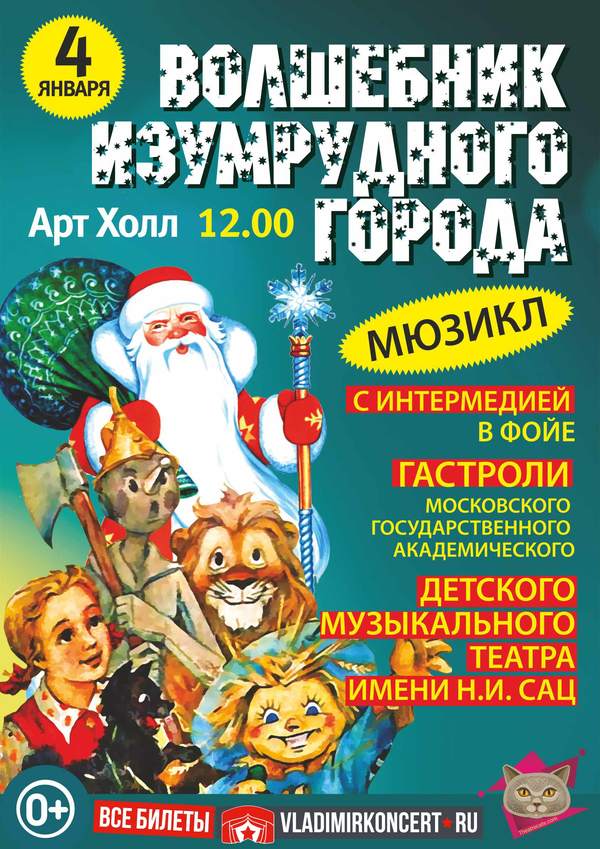 Представления во ВладимиреНовогодний мюзикл «Волшебник Изумрудного города»04 января 2023 в 12:00 04 января 2023 года Art Hall приглашает на новогодний мюзикл «Волшебник Изумрудного города» с интермедией в фойе, где состоится встреча с ДЕДОМ МОРОЗОМ! Мюзикл-сказка "Волшебник изумрудного города" — один из самых любимых зрителями спектаклей. В нем рассказывается о путешествии за счастьем и мечтой маленькой девочки Дороти и ее друзей — собачки Тотошки, Железного Дровосека и Соломенного Чучела. Сколько приключений им придется пережить…Их путешествие полно опасностей: злая колдунья строит им козни на каждом шагу, в Голубом и Желтом королевствах они едва ни сбиваются с пути, да и в самом Изумрудном городе их ждут сплошные сюрпризы, Это настоящая, веселая детская комедия, которая, впрочем, будет интересна не только маленькому зрителю. Ведь это сказка о Добре и Зле, о дружбе, о волшебстве, о необыкновенных приключениях необыкновенных героев. Этот спектакль наверняка станет самым любимым у детей, а родителям подарит чудесную возможность вспомнить собственное детство. Но, конечно же, все окончится хорошо. Цена билета: 700-1700 руб. Билеты по ссылке: https://vladimirkoncert.ru/shows/event/3139-NOVOGODNII-MYUZIKL-VOLSHEBNIK-IZUMRUDNOGO-GORODA Дата: 04 января 2023 года Начало: в 12.00 Место проведения: ART HALL Адрес: г. Владимир, ул. Северная, 2А « вернуться владимирская афиша |