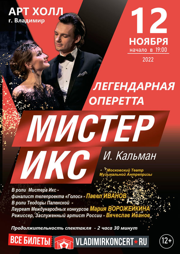 Представления во ВладимиреОперетта «Мистер Икс»12 ноября 2022 в 19:00 Театр Музыкальной Антрепризы «БУФФ-ПАРАДИЗ» Театр Музыкальной Антрепризы «БУФФ-ПАРАДИЗ» представляет классическую, легендарную оперетту «МИСТЕР ИКС».Автор идеи, режиссер постановщик: Заслуженный артист России, Солист театра «Московская Оперетта» – Вячеслав Иванов МИСТЕР ИКС – это легендарный шедевр непревзойденного мастера жанра, выдающегося мелодиста и романтика Имре Кальмана! Цирк и театр, любовь и коварство, искрометный юмор и проникновенный лиризм, очень красивые декорации и шикарные костюмы, абсолютные мировые музыкальные шлягеры в исполнении звездных артистов жанра Оперетты. Продолжительность спектакля: 2 часа 30 минут (два действия с антрактом 20 минут) Главную роль Мистера Икс играет уникальный артист, ведущий солист театра Московская Оперетта, Лауреат Международного конкурса «Оперетта ленд», финалист проекта «Голос» - ПАВЕЛ ИВАНОВ Роль Теодоры Паленской исполняет Лауреат Международных конкурсов, Солистка театра Московская Оперетта - МАРИЯ ВОРОЖЕЙКИНА В спектакле принимают участие: Народная артистка России, Солистка театра Московская Оперетта - Елена ИоноваЗаслуженный артист России, Солист театра Московская Оперетта – Вячеслав Иванов Артист театра им. Пушкина, Заслуженный артист России - Владимир Григорьев Артист театра Сатиры - Руслан Хабиев Артисты театра Московская Оперетта - Глеб Косихин, Константин Ужва, Яна Иванова Солисты Геликон опера - Вадим Летунов, Майя Барковска Цена билета: 700-2200 руб. Дата: 12 ноября 2022 года Начало: в 19.00 Место проведения: ART HALL Адрес: г. Владимир, ул. Северная, 2А « вернуться владимирская афиша |
