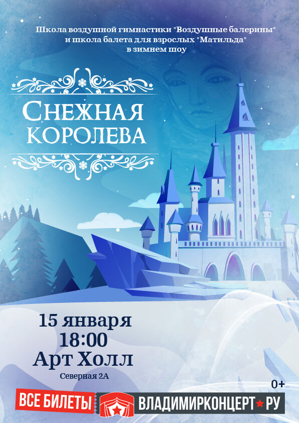 Представления во ВладимиреЗимнее шоу «Снежная королева»15 января 2023 в 18:00 Трогательная история о дружбе, любви и верности в интерпретации учениц школы воздушной гимнастики «Aerial Ballerinas» и балетной школы для взрослых «Матильда».Зимнее шоу «Снежная королева» — это оригинальное переложение известной сказки. История о пути, когда следуешь за зовом сердца без оглядки на тех, кто не верит в тебя. Когда знаешь, что невозможное — возможно. Это притча о мечте, рассказанная хрупкими девочками и девушками с железным характером, которые покорили воздух и не боятся начать танцевать во взрослом возрасте. Цена билета: 650 руб. Купить билет онлайн: https://vladimirkoncert.ru/shows/event/4243-Zimnee-shou-Snezhnaya-koroleva Дата: 15 января 2023 года Начало: в 18.00 Место проведения: ART HALL Адрес: г. Владимир, ул. Северная, 2А « вернуться владимирская афиша |