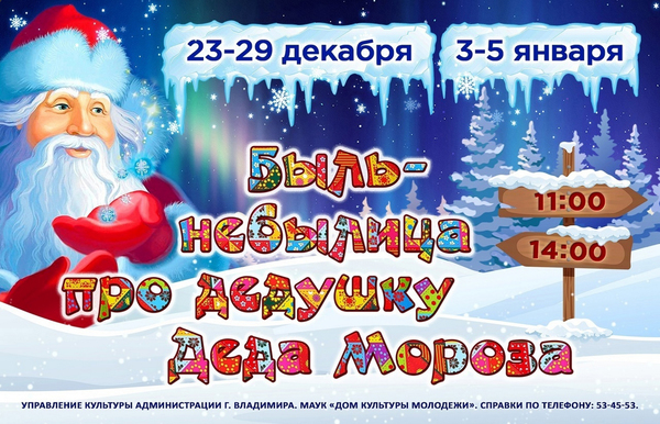 Представления во ВладимиреНовогоднее представление «Быль небылица про дедушку Деда Мороза» (0+)23 декабря 2023 в 11:00 Новогодний спектакль «Дома Культуры Молодежи» - «Быль небылица про дедушку Деда Мороза».У Деда Мороза, как и у каждого человека есть дедушка. Как вы думаете какой он? Каким вы его представляете? Вот об этом мы и расскажем вам нашу быль небылицу. Яркий, новогодний спектакль, с необычным сюжетом, в лучших традициях русских-народных сказок и былин. Спектакль с истинно русским колоритом, песнями, плясками, юмором, авторскими костюмами, новейшими спецэффектами и неожиданным появлением сказочных героев, придется по вкусу не только маленьким зрителям, но и их родителям. А главное, все наши зрители смогут познакомиться с ДЕДУШКОЙ Деда Мороза. В финале новогоднего спектакля появятся, всеми любимые, традиционные персонажи Нового года, Дед Мороз и его внучка Снегурочка, а продолжится праздник на интермедии у красавицы елочки, в фойе «Дома Культуры Молодежи». Проведите Новогодние каникулы, в атмосфере истинно русского веселья, вместе с нами. Принимаются коллективные заявки с очень выгодными и приятными бонусами по телефону 89101786557. Ну, а для родителей, которым уже не терпится скорее приобрести билетик, следите за открытыми датами! Как только на определенный день появляется групповая заявка, этот день сразу становится открыт для онлайн-продаж частным лицам! Цена билета: 500 рублей Билеты в продаже по ссылке: https://quicktickets.ru/vladimir-dk-molodyozhi/e116 Дата проведения: 23-29 декабря 2023, 3-5 января 2024 Начало: в 11.00 и 14.00 Место: Дом культуры молодёжи Адрес: г. Владимир, ул. Мира, д. 55 Справки по тел.: (4922) 54-45-53 « вернуться владимирская афиша |