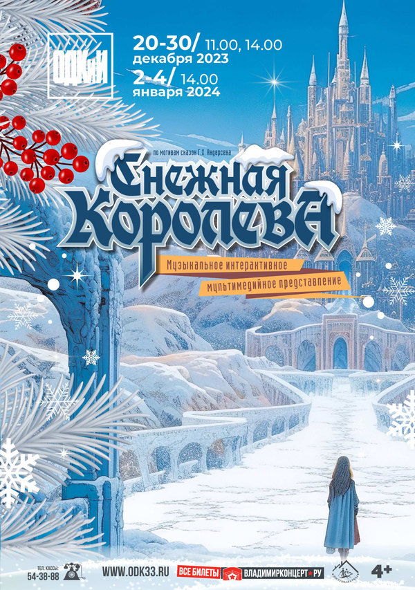 Представления во ВладимиреМузыкальное интерактивное мультимедийное представление «Снежная королева» (4+)02 января 2024 в 14:00 Музыкальное представление «Снежная королева» созданно по мотивам произведения великого датского сказочника Ганса Христиана Андерсена. Это трогательная история о маленькой Герде, которая самоотверженно отправляется выручать своего брата из беды, и неистово верит, что только доброта и любовь смогут растопить ледяное царство Снежной королевы и разрушить злые чары. Мы создали невероятно красивое волшебное шоу с захватывающим приключенческим сюжетом, в котором гармонично сочетаются искусство театра, музыки, хореографии, поразительные современные мультимедийные технологии, light-show, красочные декорации и изысканные костюмы. Живой вокал, без сомнения, растопит ваши сердца, а яркие харизматичные персонажи, веселые интерактивные игры со зрителями, встреча с Дедом Морозом и путешествие по волшебным фотозонам погрузят вас в сказочную атмосферу, где всегда есть место чуду! Спешите получить незабываемые впечатления и порадовать детей прекрасным подарком! Рекомендации по возрасту: от 4-х лет Продолжительность: 1 час 20 мин. (спектакль и интерактивная программа с Дедом Морозом и сказочными персонажами) Принимаются коллективные заявки от предприятий. Тел.: 8(909) 275-66-55 Дата: 02-04 января 2024 в 14.00 Цена: 1100 руб. Можно оплатить Пушкинской картой Билеты можно приобрести в кассе ОДКиИ. Справки по тел.: (4922) 54-38-88 Билеты онлайн по ссылке: https://vladimirkoncert.ru/shows/2375-MUZYKALNOE-INTERAKTIVNOE-MULTIMEDIINOE-PREDSTAVLENIE-SNEZHNAYA-KOROLEVA Место: Областной Дворец культуры и искусства Адрес: г. Владимир, ул. Диктора Левитана, д. 4 « вернуться владимирская афиша |