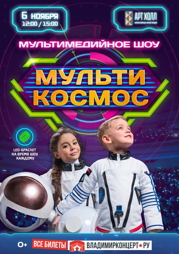 Представления во ВладимиреМультимедийное шоу «МультиКосмос»06 ноября 2023 в 12:00 «МультиКосмос» - это мультимедийный спектакль на большом профессиональном экране в сопровождении аниматоров – космических рейнджеров Астры и Лео, где все дети – участники увлекательной миссии, которые с помощью светодиодных браслетов управляют действием на экране.В интерактивной развлекательной форме зрители познакомятся с планетами Солнечной системы и совершат путешествие по просторам Вселенной. Увлекательный Космос зовет в свои неизведанные просторы, где современные технологии создадут ощущение «полного погружения». Каждому участнику-зрителю выдаются светодиодные браслеты, на время представления «МультиКосмос». «МультиКосмос» – активное путешествие по просторам Вселенной! Рекомендуем для детей от 4 до 12 лет. Дети до 3-х лет включительно могут пройти по одному билету со взрослым, не занимая отдельного места в зале (сидеть вместе с родителем), начиная с 4-х лет на ребёнка покупается отдельный билет. Администрация вправе попросить свидетельство о рождении или иной документ, подтверждающий возраст ребёнка. Продолжительность: 1 час без антракта Цена билета: 800-1700 руб. Билеты по ссылке: https://vladimirkoncert.ru/shows/event/5313-MULTIMEDIINOE-SHOU-MULTIKOSMOS Дата: 06 ноября 2023 года Начало: в 12.00 Место: Art Hall Адрес: г. Владимир, ул. Северная, 2А« вернуться владимирская афиша |