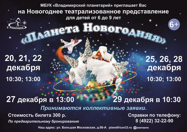Представления во ВладимиреНовогоднее театрализованное представление «Планета Новогодняя» (6+)25 декабря 2023 в 10:30 "Владимирский планетарий" представляет новогоднее театрализованное представление для детей от 6 до 9 лет.В Планетарии происходят очень странные дела – кто-то похитил все огоньки с новогодней ёлочки! Сказочница и отважные ребята отправляются на далёкую планету под названием «Новогодняя», чтобы спасти праздничное настроение и вернуть ёлке её огоньки. В увлекательном путешествии гости познакомятся с настоящим инопланетным жителем, встретят старых знакомых, исполнят заветную мечту одного из персонажей и зарядятся позитивом на весь Новый 2024 год! Цена билета: 300 руб. По предварительному бронированию. Принимаются коллективные заявки. Справки по тел.: 8 (4922) 32-32-90 Дата: 25, 26, 28 декабря 2023 в 10.30 и 13.00 27 декабря 2023 13.00 29 декабря 2023 10.30 Место проведения: Владимирский планетарий Адрес: г. Владимир , ул. Большая Московская 66а « вернуться владимирская афиша |