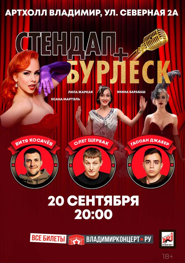 Представления во ВладимиреШоу «Бурлеск + Стендап»20 сентября 2024 в 20:00 Это буря эмоций, смеха и наслаждение жизнью! В этот вечер для вас: 4 пикантных танца в жанре бурлеск и выступления 3-х первоклассных комиков из Москвы, которых вы точно видели по ТВ.Бурлеск / Burlesque - разновидность развлекательного театрального шоу, близкого к жанрам: мюзикл, кабаре и водевиль. Основными элементами бурлеск-шоу являются танцевальные и цирковые номера. Жанр начал возрождаться в начале 1990-х, но вообще-то существует он уже 100 лет! На шоу Бурлеск + Стендап приходят для того, чтобы перезарядиться и наполниться позитивной энергией, эстетикой и испытать удовольствие от неповторимой атмосферы шоу. Для максимального погружения в атмосферу - выбирайте праздничный наряд и приходите зажигать! Проведёт мероприятие Ханна Колокол. Комики: Олег Щербак (финалист Comedy Баттл», участник проекта «Это про меня», автор легендарного интернет сериала «Лёха» и просто невероятно душевный и смешной комик), Гассан Джабер("Stand Up комик Финалист Comedy Баттл ТНТ Открытый микрофон ТНТ» очень смешной южанин) и Витя Косачёв (Участник шоу «Открытый Микрофон» и супер-атмосферный комик). Этот вечер заменит 100 походов к психологу, 20 разговоров на кухне и одно путешествие на Мальдивы. Решение принимать вам, мы просто гарантируем вам незабываемое приключение! Цена билета: 1900-3900 руб. Билеты по ссылке: https://vladimirkoncert.ru/shows/event/7421-SHOU-BURLESK-STENDAP Дата: 20 сентября 2024 года Начало: в 20.00 Место: Art Hall Адрес: г. Владимир, ул. Северная, 2А Информация с https://arthall.org/events/kontserty/shou-burlesk-stendap « вернуться владимирская афиша |