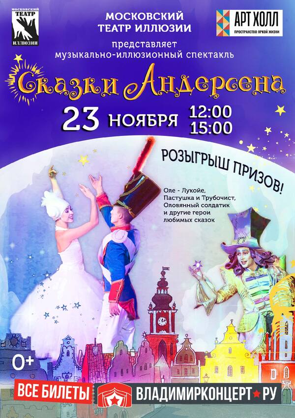 Представления во ВладимиреМузыкально-иллюзионный спектакль «Сказки Андерсена»23 ноября 2025 в 12:00 Театр Иллюзии приоткроет двери в мир волшебства, где можно будет встретить и таинственного Оле-Лукойе, и маленькую Иду, и стойкого Оловянного солдатика, и влюбленных Пастушку и Трубочиста.Каждая история будет рождаться прямо на глазах у зрителей, которые вместе с героями сказок Андерсена побывают на волшебном балу цветов, прогуляются по крышам ночного Копенгагена и поразятся преданности рыцаря, отдавшего свое сердце изящной бумажной балерине. Яркие костюмы и декорации, сложные трюки, необычные трансформации, загадочные исчезновения и превращения — все это в увлекательном путешествии по самым известным сказкам Андерсена. Действующие лица: Оле-Лукойе – Артем Ермак Кукла Софи, Пастушка – Надежда Гусакова Цветы – Полина Козлова, Анна Сыч, Анжела Цихиева Куклы – Екатерина Бурлака, Анастасия Иванчук Петрушка, Карточный шут Джокер – Дарья Кутырина/ Дария Гаврилова, Микаель Гаспарян Рыцарь (трансформер) – Олег Владимиров Валет Треф (фокусы с картами) – Андрей Ткачук Дама Пик и Валет Бубен (гильотина из карт) – Полина Козлова, Вячеслав Чернов Фарфоровый император – Олег Владимиров Трубочист – Андрей Ведякин Генерал-капитан-сержант Козлоног – Игорь Тюнин Гоблин – Николай Назаренко Гоблин – Михаил Ярвелов Бумажная балерина – Анжела Цихеева / Екатерина Бурлака Оловянный солдатик – Марина Ермак Постановочная группа Режиссер-постановщик - Белолипская Евгения Валентиновна Дети до 3-х лет бесплатно, без предоставления отдельного места. Вас ждет Розыгрыш призов: сладкие подарки, мягкие игрушки и многое другое. Длительность: 1 час 10 минут Дата: 23 ноября 2025 Начало: в 12.00 и 15.00 Билеты по ссылке: 23 ноября в 12.00 https://vladimirkoncert.ru/shows/event/9259-SKAZKI-ANDERSENA 23 ноября в 15.00 https://vladimirkoncert.ru/shows/event/9260-SKAZKI-ANDERSENA Место: Art Hall Адрес: г. Владимир, ул. Северная, 2А Информация с https://arthall.org/events/spektakl/skazki-andersena « вернуться владимирская афиша |
