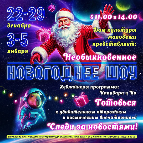 Представления во ВладимиреСказочное представление «Необыкновенное Новогоднее шоу» (0+)22 декабря 2025 в 11:00 Дом культуры молодёжи приглашает детей и их родителей на грандиозную премьеру — авторское «Необыкновенное новогоднее шоу»! Яркое, космическое и по-настоящему волшебное музыкальное представление, которое станет главным событием праздника. Хедлайнерами шоу станут лучшие и самые популярные детские друзья на сегодняшний день — Капибара и её весёлая компания... Вместе с ними юные зрители отправятся в межзвёздное приключение, чтобы спасти Новый год и узнать, где живут настоящие чудеса. Это шоу создано для тех, кто сомневается. Даже если вы или ваш ребёнок уже не верите в чудеса или не уверены, что под Новый год сбываются самые заветные желания, — приходите к нам! Мы докажем, что Дед Мороз существует, а чудеса обязательно приходят к тем, кто в них верит. И, конечно в финале праздника всех ждет ,встреча с Дедом Морозом и Снегурочкой у новогодней ёлки. И, конечно в финале праздника всех ждет ,встреча с Дедом Морозом и Снегурочкой у новогодней ёлки. Цена билета: 600 рублей Билеты уже в продаже: https://quicktickets.ru/vladimir-dk-molodyozhi/e258 Даты: 22.12.2025 - 29.12.2025 в 11:00 и в 14:00 03.01.2026 - 05.01.2026 в 11:00 и в 14:00 Место проведения: Дом культуры молодежи, Концертный зал Адрес: г. Владимир, ул. Мира, д. 55 Информация с https://vk.com/wall-51317454_10176 « вернуться владимирская афиша |