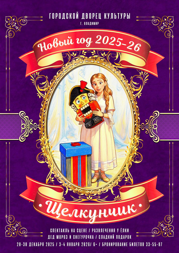 Представления во ВладимиреНовогодняя сказка "Щелкунчик" (6+)03 января 2026 в 11:00 Новогоднее представление в ГДКВолшебный спектакль на Большой сцене по сказке Э. Гофмана «Щелкунчик», интерактивная программа у елки (микс традиционных хороводов и зажигательной детской «тусовочки»; поздравление от Деда Мороза и Снегурочки). В стоимость каждого билета включен небольшой сладкий ПОДАРОК. Кажется, что сказка всем давно знакома.... Но... Вы знаете, кто такая принцесса Пирлипат? За что Мышиный король «точит зуб» на Щелкунчика? И правда ли, что у заколдованного принца деревянное сердце? Масштабные декорации, необычные костюмы, массовые батальные сцены, фокусы и иллюзии, захватывающий сюжет и волшебная музыка. Путешествия во времени и пространстве, превращения и трансформации. Вы уверены, что знаете эту сказку?! Цена билета: 800 руб. Билеты по ссылке: https://quicktickets.ru/vladimir-dk/e182 Принимаются коллективные заявки от школ и организаций. Для бронирования билетов звоните по телефону 8 (4922) 33-55-87 Дата: 03.01.2026 - 04.01.2025 в 11.00 и в 14.00 Место проведения: Городской Дворец культуры Адрес: Владимир, ул. Горького, д. 54 Информация с https://vk.com/wall-42084592_14918 « вернуться владимирская афиша |