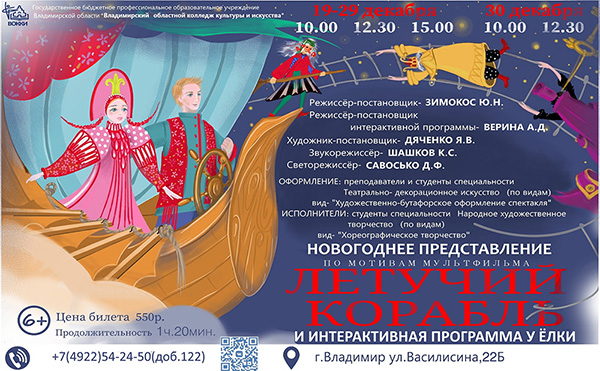 Владимирский областной колледж культуры и искусства и специальность Народное художественное творчество (по видам), вид - «Хореографическое творчество» анонсируют новогоднее представление «Летучий корабль», по мотивам одноименного советского мультфильма.