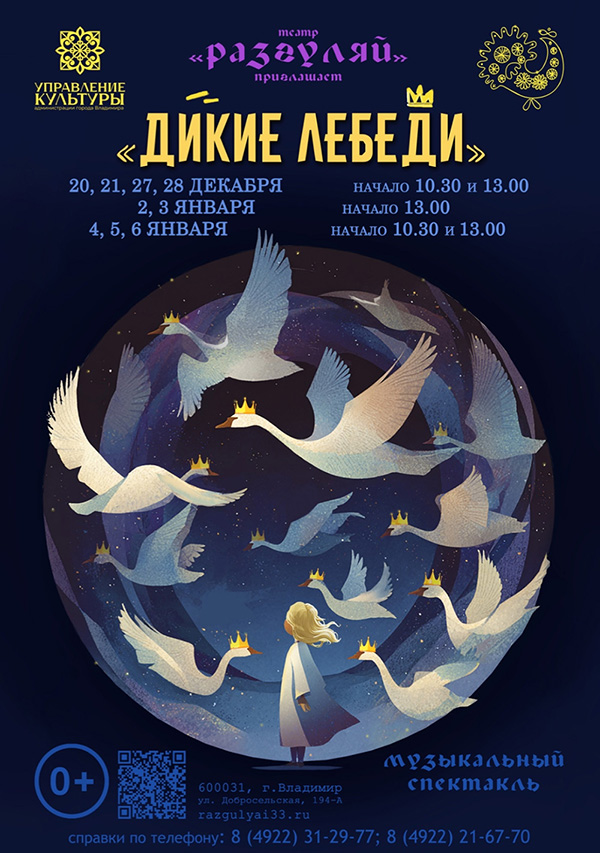 Представления во ВладимиреПРЕМЬРА! Музыкальный спектакль для детей "Дикие лебеди"02 января 2026 в 13:00 Новогоднее представление для детей Дорогие друзья!Скоро наступит самое волшебное время года, и "Музыкальный Театр «Разгуляй»"приглашает вас окунуться в атмосферу новой сказки вместе с нашим театром! Новогодняя программа 2025: Музыкальный спектакль «Дикие лебеди» по мотивам одноименной сказки Г. Х. Андерсена Волшебная история о юной принцессе Элизе и ее одиннадцати братьях в исполнении артистов театра — это яркое, музыкальное представление. Злая мачеха наложила проклятье, превратив братьев Элизы в диких лебедей. Теперь судьба королевства и жизнь принцев в руках юной принцессы, которой предстоит пройти через немыслимые испытания, сохраняя молчание и сплетая спасительные рубашки из жгучей крапивы для своих братьев. История о величайшей сестринской любви, отваге и стойкости, где каждый укол крапивы и каждый миг молчания приближают чудо. Удастся ли Элизе разорвать цепи проклятья, прежде чем она сама будет сломлена, вы узнаете, посетив наш спектакль. Интерактивное представление с Дедом Морозом и Снегурочкой После волшебной сказки артисты театра пригласят зрителей на интерактивное представление "Здравствуй, Новый год". Вместе с Дедом Морозом и Снегурочкой они зажгут Новогоднюю елку, будут петь, танцевать и участвовать в веселых играх. Стоимость билетов: В выходные дни: 2, 3 января — в 13:00 4, 5, 6 января — в 10:30 и 13:00 Цена билета: 900 рублей Билеты в открытой продаже: с 05 ноября 2025 Билеты по ссылке: https://quicktickets.ru/vladimir-teatr-razgulyaj/e28 Место проведения: Музыкальный Театр «Разгуляй» Адрес: г. Владимир, ул. Добросельская, д. 194-а Телефон для справок: 8 (4922) 31-29-77, 21-67-70 Информация с https://vk.com/wall-96009189_1742 « вернуться владимирская афиша |
