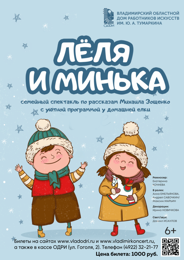 Представления во ВладимиреСемейный спектакль «Лёля и Минька»03 января 2026 в 15:00 Спектакль поставлен по серии автобиографических рассказов Михаила Зощенко. Смешные и поучительные, простые и многослойные — они погрузят нас в атмосферу дореволюционной России 20 века, познакомят с семейными традициями и правилами воспитания того времени. Зрители совершат небольшое путешествие по детским воспоминаниям, где каждая история — остановка дачной электрички. Мы не только посмеемся над забавными приключениями главных героев — непоседливой девочки Лёли и ее любознательного брата Миньки, но и сможем поразмышлять о том, как хорошие и плохие поступки влияют на нашу жизнь и на жизнь окружающих нас людей.Теплый и душевный спектакль о детских шалостях и их последствиях завершится в каминном зале уютной программой возле домашней новогодней елки. Режиссер спектакля — Екатерина Кочнева. В ролях: Анна Емельянова Андрей Савушкин/Максим Марьин. Продолжительность спектакля — 1 час, без антракта. Продолжительность программы после спектакля — 15-20 минут. Дата: 03 января 2026 в 15.00 04 января 2026 в 11.00 и в 13.00 05 января 2026 в 11.00 Цена билета: 1000 руб. Билеты в кассе ОДРи и по ссылке: 3 января в 15.00 https://vladimirkoncert.ru/shows/event/10325-Semeinyi-spektakl-Lelya-i-Minka 4 января в 11.00 https://vladimirkoncert.ru/shows/event/10326-Semeinyi-spektakl-Lelya-i-Minka 4 января в 13.00 https://vladimirkoncert.ru/shows/event/10327-Semeinyi-spektakl-Lelya-i-Minka 5 января в 11.00 https://vladimirkoncert.ru/shows/event/10328-Semeinyi-spektakl-Lelya-i-Minka Место проведения: Владимирский областной Дом работников искусств Адрес: г. Владимир, ул. Гоголя, д. 2 Информация с https://vladodri.ru/events/semejnyj-spektakl-ljolja-i-minka/ « вернуться владимирская афиша |