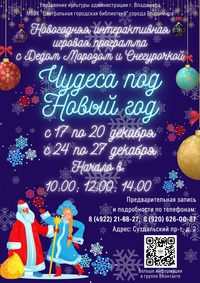 03 декабря 2024 в 11:00 17, 18, 19, 20, 24, 25, 26, 27 декабря 2024 в Центральной городской библиотеке г. Владимира 03 декабря 2024 в 09:00 22 декабря 2024 года в 12:00 или в 15:00 в Областной библиотеке для детей и молодежи 21 ноября 2024 в 14:00 08 декабря 2024 года в 14.00 в Музейном центре «Палаты» 03 декабря 2024 в 11:00 Абонемент №3, 3А, концерт №2