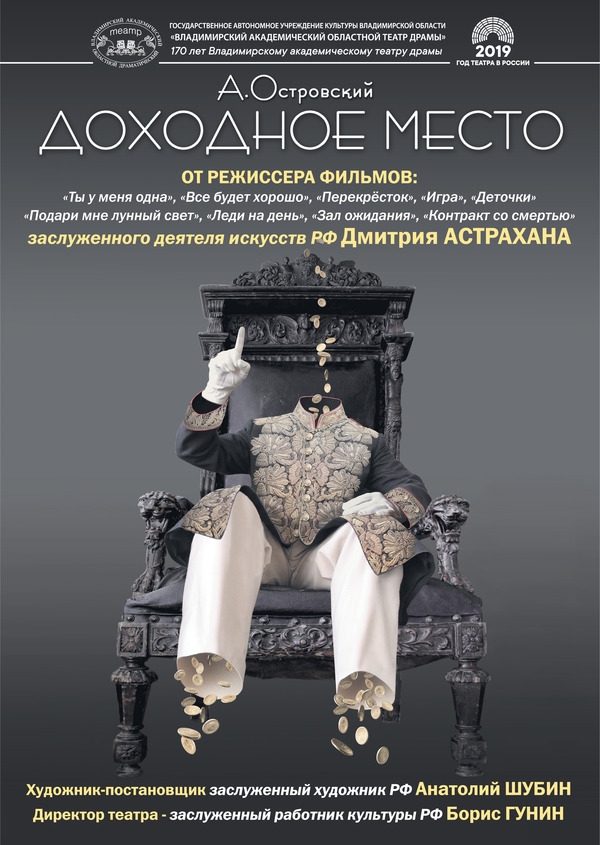 Спектакли во Владимире Спектакль «Доходное место»23 апреля 2025 в 18:00 Владимирский академический театр драмы Спектакль проходит на сцене Владимирской областной филармонии по адресу: пр-т Ленина, д.1 Жанр: Комедия в двух действиях Автор: А. Н. Островский Премьера состоялась 1 марта 2019 года У частие спектакля в фестивалях: – участник Театрального фестиваля "Вперёд к Островскому" (г. Санкт-Петербург, 2021 г.) 21 ноября 2020 года спектакль "Доходное место" был показан на канале ОТР общественное российское телевидение. – участник VI Международного театрального фестиваля русской классической драматургии "Горячее сердце" (г. Кинешма, 2023 г.). Cпециальными дипломами фестиваля награждены артисты Владимирского академического театра драмы Галина Фатхутдинова за роль Фелисаты Кукушкиной и Анатолий Шалухин за роль Онисима Белогубова. – участник ХI международного театрального фестиваля "Золотая провинция" (г. Новокузнецк, 2023 г.). Cпециальными дипломами фестиваля награждены артисты Владимирского академического театра драмы Галина Фатхутдинова за роль Фелисаты Кукушкиной и Анатолий Шалухин за роль Онисима Белогубова. – участник IX Международного театрального фестиваля "Русская классика" (г. Орел, 2023 г.) Специальными дипломами фестиваля награждены артисты Владимирского академического театра драмы народный артист РФ, лауреат Национальной премии "Золотая маска", премии Правительства РФ им Ф. Волкова, областной премии им. Е. Евстигнеева Николай Горохов за роль Юсова, Галина Фатхутдинова за роль Фелисаты Кукушкиной и Анатолий Шалухин за роль Онисима Белогубова. За лучшую режиссуру спектакля – заслуженный деятель искусств РФ Дмитрий Астрахан. – участник юбилейных гастролей Владимирского академического театра драмы в Санкт-Петербурге на сцене Государственного молодежного театра на Фонтанке (ноябрь, 2023 г.) – участник XVII Межрегионального театрального фестиваля имени Н.Х. Рыбакова (г. Тамбов, 2024г.) Премия в номинации "Актер России" присуждена артисту Александру Аладышеву за роль Жадова Дмитрий Астрахан, режиссер со всемирной известностью, по-новому взглянул на классические тексты. Нестареющая классика на сцене одного из самых старых театров страны. Этот спектакль рассказывает о падении нравов, о том, как принципы меркнут перед любовью и нищетой, о том, что за каждым углом могут ждать разительные перемены. Одному из героев все же повезло. Повезло в том, что перед самым падением, перед самым предательством самого себя вмешались обстоятельства и помогли ему. Так может, это значит, что еще не все потеряно? Может быть, мы еще в силах что-то изменить? Длительность спектакля: 3 ч. 10 мин. (1 акт - 1 ч. 35 мин.) Цена билета: 600 руб. Действует Пушкинская карта Билеты по ссылке: https://vladimir.kassy.ru/events/teatr/2-2150/ Дата: 23 апреля 2025 Начало: в 18.00 Место проведения: Владимирская областная филармония Адрес: г. Владимир, пр-т Ленина, д.1 Информация с https://www.dramavladimir.ru/playbill#aprel « вернуться владимирская афиша другие спектакли во Владимире |