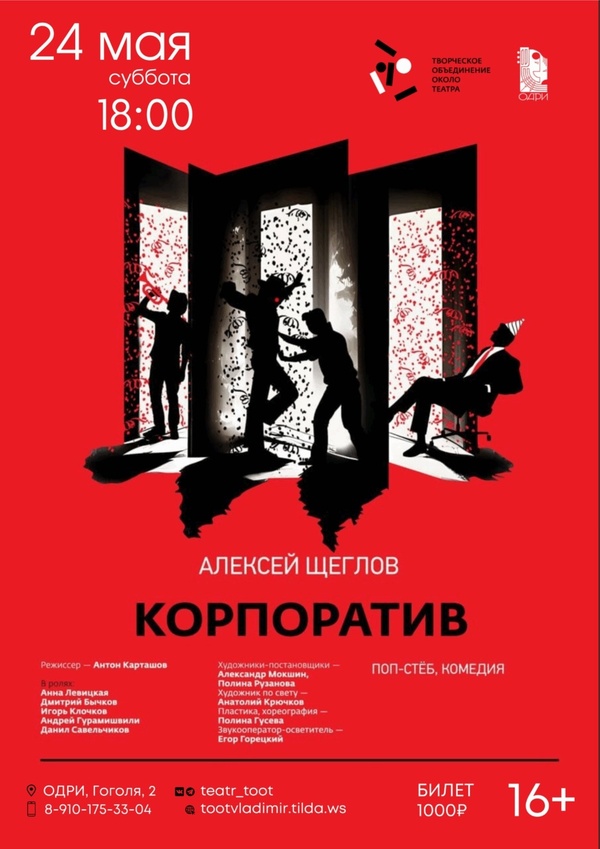 Спектакли во Владимире Спектакль «Корпоратив» (16+)24 мая 2025 в 18:00 Камерный театр Т.О.О.Т. Устроить праздник всегда непросто, а устроить хороший праздник для женщин — задача почти невыполнимая. В процессе подготовки корпоратива мужской части коллектива приходится отчасти пересмотреть свои взгляды на жизнь, и осознать, окончательно и бесповоротно, что женщины — это наше всё. «Корпоратив» — это признание в любви прекрасной половине человечества. Спектакль поставлен по одноименной пьесе Алексея Щеглова. Режиссер — Антон Карташов. Режиссер по пластике — Полина Гусева Режиссеры-постановщики — Полина Рузанова, Александр Мокшин. В ролях: ПОЛЫХАЕВ, директор офиса — Игорь Клочков ВАСИЛИЙ ЖЕРЕБЦОВ, менеджер по продажам — Дмитрий Бычков СЕМЕН ЕГОРЫЧ, бухгалтер — Андрей Гурамишвили ВАДИК, системный администратор — Данила Савельчиков ТЕТЯ ШУРА, уборщица — Анна Левицкая Цена билета: 1000 руб. Билеты по ссылке: https://vmuzey.com/event/spektakl-korporativ-2 Дата: 24 мая 2025 Начало: в 18.00 Место проведения: Владимирский областной Дом работников искусств Адрес: г. Владимир, ул. Гоголя, 2 Информация с https://vladodri.ru/events/spektakl-korporativ-7/ « вернуться владимирская афиша другие спектакли во Владимире |