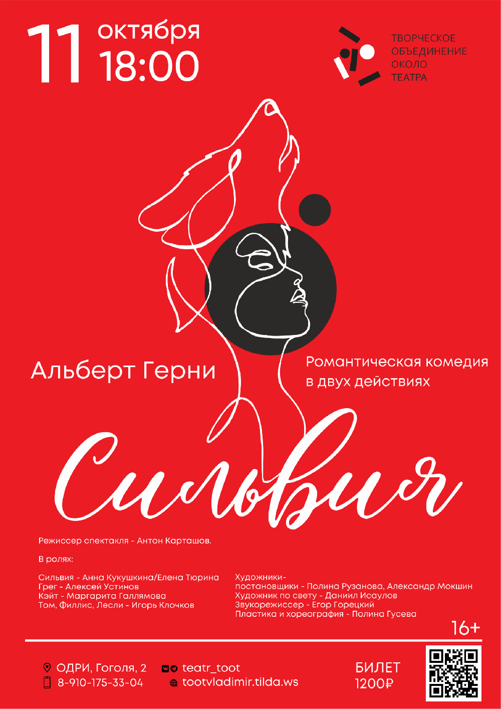 Спектакли во Владимире Спектакль «Сильвия»11 октября 2025 в 18:00 Камерный театр Т.О.О.Т. Спектакль поставлен по пьесе писателя и драматурга Альберта Герни в переводе С.Таска. В центре сюжета – обычная семья, в которой однажды появляется… собака. Вместе с ней в дом неизбежно придет счастье. Но сначала героям придется преодолеть взаимные обиды, ревность и непонимание. У жизнерадостной Сильвии получается не просто вернуть супругам уходящее чувство любви, но и наполнить их жизни смыслом, избавить от одиночества, объяснить своим хозяевам, что же такое настоящее счастье. В ролях: Сильвия — Анна Кукушкина/Елена Тюрина Грег — Алексей Устинов Кейт — Маргарита Галлямова Том, Лесли, Филис — Игорь Клочков Режиссер спектакля — Антон Караташов Цена билета: 1200 рублей Онлайн билеты по ссылке: https://vmuzey.com/event/spektakl-silviya-3 Дата: 11 октября 2025 Начало: в 18.00 Место проведения: Владимирский областной Дом работников искусств Адрес: г. Владимир, ул. Гоголя, 2 Информация с https://vladodri.ru/events/spektakl-kamernogo-teatra-t-o-o-t-silvija/ « вернуться владимирская афиша другие спектакли во Владимире |