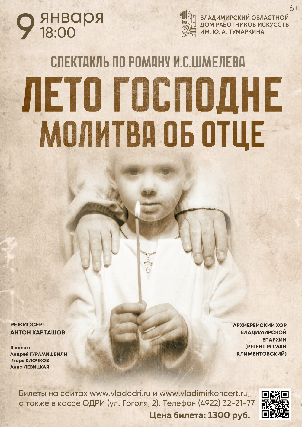 Спектакли во Владимире Спектакль «Лето Господне. Молитва об отце»09 января 2026 в 18:00 Спектакль «Лето Господне. Молитва об отце» — очередная постановка Владимирского областного дома работников искусств в рамках регионального проекта «Живое слово», поддержанного Министерством культуры Владимирской области. В основе спектакля — роман Ивана Шмелёва «Лето Господне» — одно из самых известных в классической русской литературе произведений о детстве, в котором описывается жизнь в патриархальной купеческой семье через церковный богослужебный год. Зритель станет свидетелем духовного взросления главного героя — шестилетнего мальчика Вани, вместе с ним будет узнавать традиции важных православных праздников и проживать скорби, связанные с болезнью и смертью отца. В ролях: Андрей Гурамишвили, Игорь Клочков, Анна Левицкая Режиссер спектакля — Антон Карташов В спектакле участвует архиерейский хор Свято-Успенского Кафедрального собора (регент Роман Климентовский). Продолжительность: 1 час В кассе ОДРИ (Гоголя, 2) вы можете купить билет по номинальной стоимости 1300 рублей. Действует Пушкинская карта Билеты онлайн: https://vk.cc/cSVt8H Дата: 09 января 2026 Начало: в 18.00 Место проведения: Владимирский областной Дом работников искусств Адрес: г. Владимир, ул. Гоголя, 2 Информация с https://vladodri.ru/events/spektakl-leto-gospodne-molitva-ob-otce-8/ « вернуться владимирская афиша другие спектакли во Владимире |