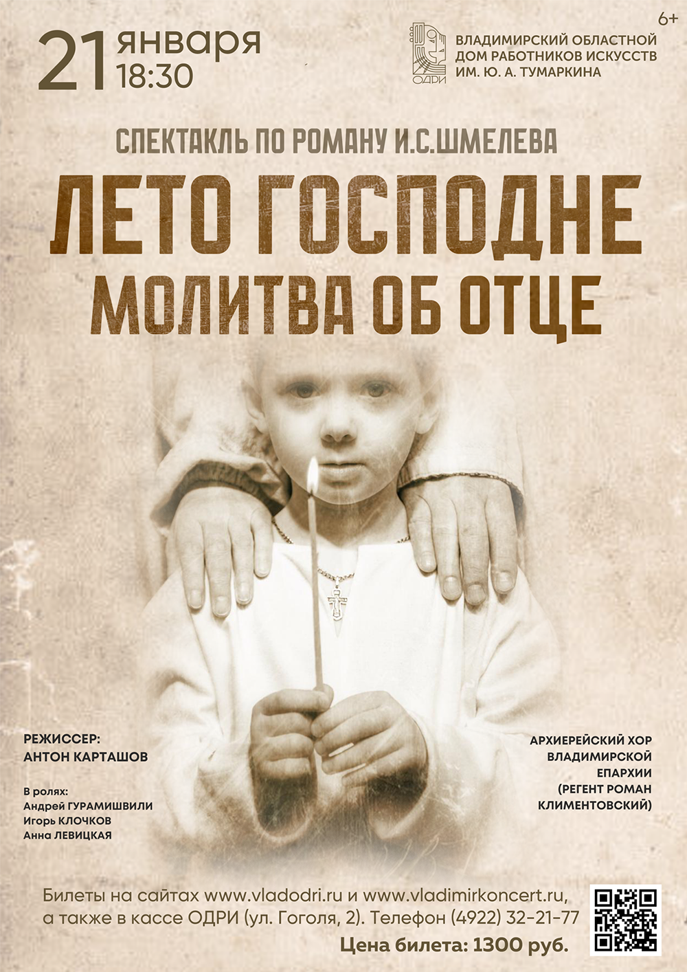 Спектакли во Владимире Спектакль «Лето Господне. Молитва об отце»21 января 2026 в 18:30 Спектакль «Лето Господне. Молитва об отце» — очередная постановка Владимирского областного дома работников искусств в рамках регионального проекта «Живое слово», поддержанного Министерством культуры Владимирской области. В основе спектакля — роман Ивана Шмелёва «Лето Господне» — одно из самых известных в классической русской литературе произведений о детстве, в котором описывается жизнь в патриархальной купеческой семье через церковный богослужебный год. Зритель станет свидетелем духовного взросления главного героя — шестилетнего мальчика Вани, вместе с ним будет узнавать традиции важных православных праздников и проживать скорби, связанные с болезнью и смертью отца. В ролях: Андрей Гурамишвили, Игорь Клочков, Анна Левицкая Режиссер спектакля — Антон Карташов В спектакле участвует архиерейский хор Свято-Успенского Кафедрального собора (регент Роман Климентовский). Продолжительность: 1 час В кассе ОДРИ (Гоголя, 2) вы можете купить билет по номинальной стоимости 1300 рублей. Действует Пушкинская карта Билеты онлайн: https://vk.cc/cT3AFY Дата: 21 января 2026 Начало: в 18.30 Место проведения: Владимирский областной Дом работников искусств Адрес: г. Владимир, ул. Гоголя, 2 Информация с https://vladodri.ru/events/spektakl-leto-gospodne-molitva-ob-otce-9/ « вернуться владимирская афиша другие спектакли во Владимире |