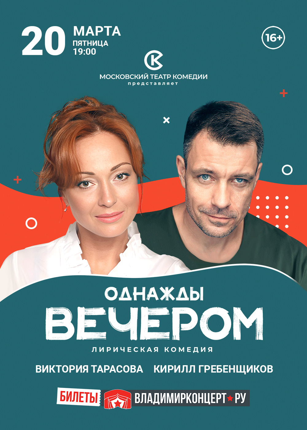 Спектакли во Владимире Спектакль "Однажды вечером" (16+)20 марта 2026 в 19:00 По мотивам пьесы Александра Гельмана «Скамейка». Комедия со смыслом, и, конечно, о любви. Встретились двое — мужчина и женщина. За один вечер, кажется, они прожили целую жизнь. На глазах у зрителей разворачивается калейдоскоп эмоций, от любви до ненависти, от страсти до разочарования, здесь правда и ложь, романтика и интриги. И особенный смысл этой случайной встречи майским вечером на скамейке. Актерский состав: Кирилл Гребенщиков Виктория Тарасова Продолжительность: 1 час 30 минут Цена билета: 1000-3700 руб. Билеты по ссылке: https://vladimirkoncert.ru/shows/event/9473-Odnazhdy-vecherom Дата: 20 марта 2026 Начало: в 19.00 Место: Арт Холл Адрес: г. Владимир, ул. Северная, 2А Информация с https://arthall.org/events/spektakl/odnazhdy-vecherom « вернуться владимирская афиша другие спектакли во Владимире |
