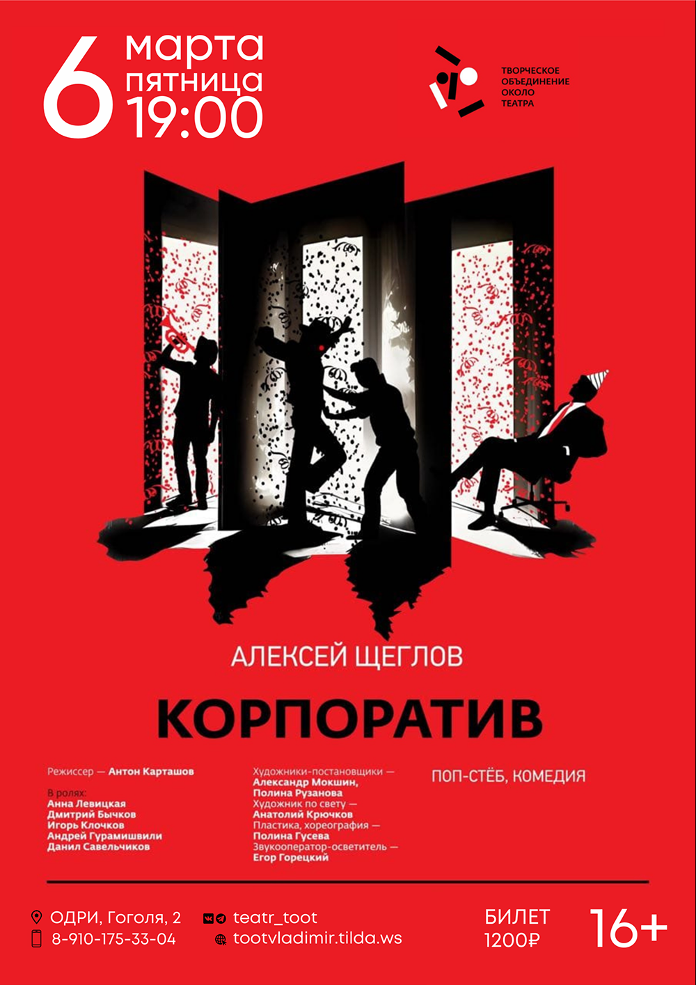 Спектакли во Владимире Спектакль «Корпоратив»06 марта 2026 в 19:00 Камерный театр Т.О.О.Т. Устроить праздник всегда непросто, а устроить хороший праздник для женщин — задача почти невыполнимая. В процессе подготовки корпоратива мужской части коллектива приходится отчасти пересмотреть свои взгляды на жизнь, и осознать, окончательно и бесповоротно, что женщины — это наше всё. «Корпоратив» — это признание в любви прекрасной половине человечества. Спектакль поставлен по одноименной пьесе Алексея Щеглова. Режиссер — Антон Карташов Режиссер по пластике — Полина Гусева Режиссеры-постановщики — Полина Рузанова, Александр Мокшин В ролях: ПОЛЫХАЕВ, директор офиса — Игорь Клочков ВАСИЛИЙ ЖЕРЕБЦОВ, менеджер по продажам — Дмитрий Бычков СЕМЕН ЕГОРЫЧ, бухгалтер — Андрей Гурамишвили ВАДИК, системный администратор — Данила Савельчиков ТЕТЯ ШУРА, уборщица — Анна Левицкая Цена билета: 1200 руб. Билеты в кассе ОДРИ и по ссылке: https://vladimirkoncert.ru/shows/event/10676-Spektakl-Korporativ Дата: 06 марта 2026 Начало: в 19.00 Место проведения: Владимирский областной Дом работников искусств Адрес: г. Владимир, ул. Гоголя, 2 Информация с https://vladodri.ru/events/spektakl-korporativ-10/ « вернуться владимирская афиша другие спектакли во Владимире |