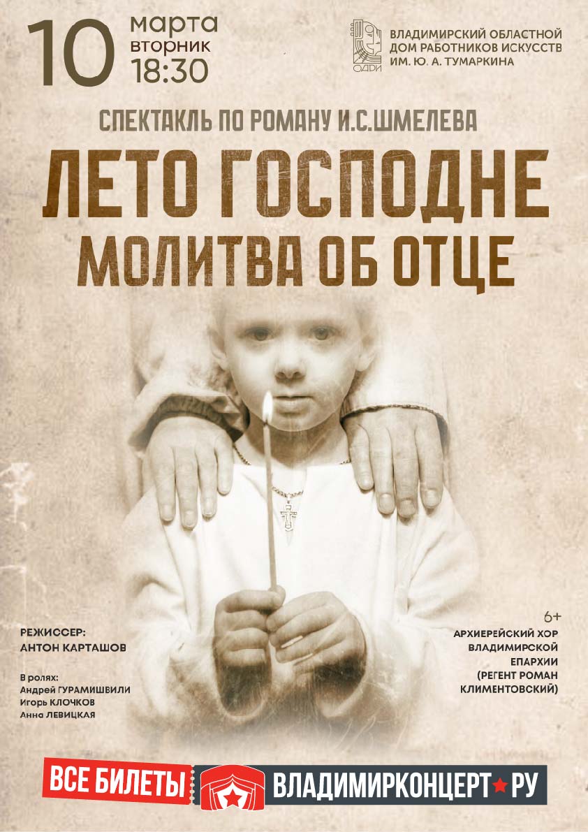Спектакли во Владимире Спектакль «Лето Господне. Молитва об отце»10 марта 2026 в 18:30 Спектакль «Лето Господне. Молитва об отце» — очередная постановка Владимирского областного дома работников искусств в рамках регионального проекта «Живое слово», поддержанного Министерством культуры Владимирской области. Зритель станет свидетелем духовного взросления главного героя — шестилетнего мальчика Вани, вместе с ним будет узнавать традиции важных православных праздников и проживать скорби, связанные с болезнью и смертью отца. В ролях: Андрей Гурамишвили, Игорь Клочков, Анна Левицкая Режиссер спектакля — Антон Карташов В спектакле участвует архиерейский хор Свято-Успенского Кафедрального собора (регент Роман Климентовский). Продолжительность: 1 час Цена билета: 1300 руб. Билеты в кассе ОДРИ и по ссылке: https://vladimirkoncert.ru/shows/event/10664-Spektakl-Leto-Gospodne-Molitva-ob-ottse Дата: 10 марта 2026 Начало: в 18.30 Место проведения: Владимирский областной Дом работников искусств Адрес: г. Владимир, ул. Гоголя, 2 Информация с https://vladodri.ru/events/spektakl-leto-gospodne-molitva-ob-otce-10/ « вернуться владимирская афиша другие спектакли во Владимире |
