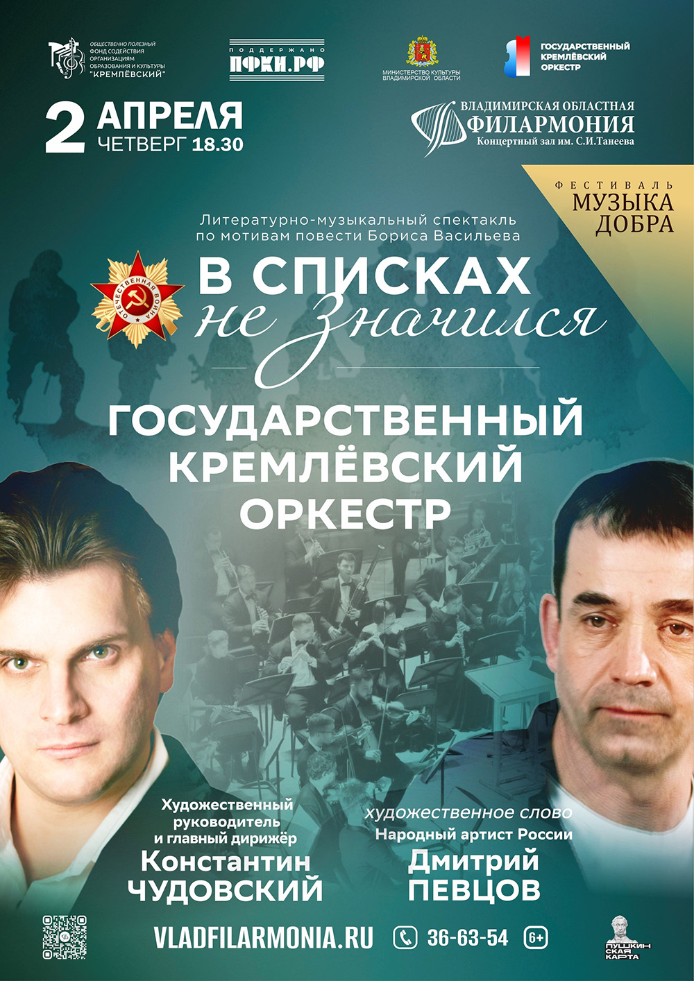 Спектакли во Владимире Литературно-музыкальный спектакль «В списках не значился»02 апреля 2026 в 18:30 Фестиваль «Музыка добра» В основе проекта «В списках не значился», посвященного Победе в Великой Отечественной войне, лежит одно из ярчайших произведений – повесть Бориса Васильева о защитнике Брестской крепости Николае Плужникове, 19-летнем герое, который прошел через ад, но не был сломлен. Спустя долгое время противостояния на вопрос немецкого офицера о его имени уже полуседой, ослепший и обмороженный он гордо ответил: «Я – русский солдат». Актерский талант Дмитрия Певцова не только заново открывает литературное произведение публике, он побуждает каждого человека, находящегося в зале, прожить все то, что испытал Плужников, почти год сражаясь с врагом до последнего патрона. Эффект воздействия на зрителя усиливает интерпретация великих музыкальных произведений Художественным руководителем и главным дирижером Государственного Кремлевского оркестра Константином Чудовским. В этот вечер зрители станут очевидцами обороны Брестской крепости, а фрагменты великих музыкальных произведений Чайковского, Шостаковича, Прокофьева, Бетховена, Брамса, Баха и эксклюзивный видеоконтент, в основе которого фото- и киноматериалы из архивов Президентской библиотекой Управления делами Президента РФ, усилит эффект присутствия в центре событий того времени. Формат синтетического действа, в котором проходит этот масштабный литературно-музыкальный спектакль, создаст особую атмосферу, которая поможет публике прочувствовать трагизм событий военных лет и величие подвига наших предков. «…Время не донесло ни его имени, ни звания, но мы знаем, что это был русский солдат». Организатор проекта – Общественно полезный фонд содействия организациям образования и культуры «Кремлёвский». Концерт проходит при поддержке Президентского фонда культурных инициатив Продолжительность: 2 часа 20 минут с антрактом Исполнители: Государственный Кремлевский оркестр Народный артист России Дмитрий ПЕВЦОВ Цена билета: 800-1600 Доступно приобретение билетов по Пушкинской карте Билеты по ссылке: https://iframeab-pre10088.intickets.ru/seance/70313272 Дата: 02апреля февраля 2026 Начало: в 18.30 Место проведения: Владимирская областная филармония Адрес: г. Владимир, проспект Ленина, дом 1 Информация с https://www.vladfilarmonia.ru/afisha/concerts-in-vladimir/dmitriy-pevtsov-i-gosudarstvennyy-kremlevskiy-orkestr-s-programmoy-v-spiskakh-ne-znachilsya/ « вернуться владимирская афиша другие спектакли во Владимире |