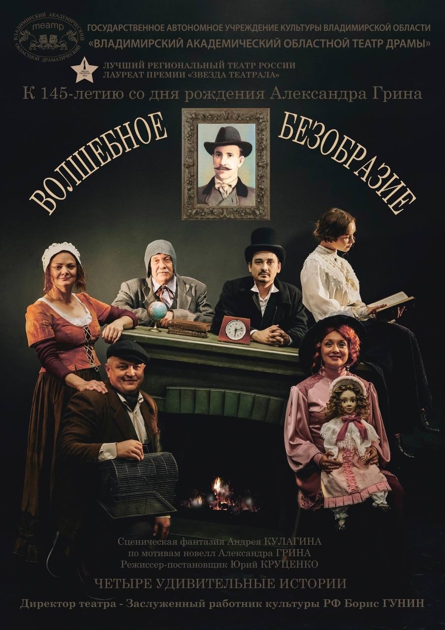 Спектакли во Владимире Спектакль "Волшебное безобразие" (14+)19 марта 2026 в 18:00 Четыре удивительные истории Сценическая фантазия Андрея Кулагина по мотивам новелл Александра Грина Премьера спектакля состоялась 6 октября 2024 года 23 августа 2025 года исполнится 145 лет со дня рождения Александра Грина (Александра Степановича Гриневского). В жизни человечества случаются периоды, когда возникает настоятельная душевная массовая потребность в той или иной конкретной музыке из Прошлого. Или в мудрости, в атмосфере, в строках и образах из произведений того или иного писателя... Вероятно, необходимость в новеллах Александра Грина — это тоже наша не совсем осознанная потребность, разлитая в воздухе нашего непростого, грозового времени? Автор пьесы по мотивам новелл А.С. Грина Андрей Кулагин — человек, остро ощущающий «пульс Времени». В своей драматургической фантасмагории он постарался соединить малоизвестные, но актуальные рассказы автора «Алых парусов» и «Блистающего мира», сделав особый акцент на контрастах между сияющей мечтой, иллюзией, романтической окрылённостью и жестокой прозой жизни бедняков, пьяниц, сирот, террористов, заблудившихся в реальности деклассированных элементов. «Волшебное безобразие» — один из таких горьких рассказов Грина. Он не был сказочником. Его мечты, аллегории — мотивированный призыв к действию. Все чудеса в наших руках! Из горечи этих контрастов непременно пробивается тема любви и человечности, преклонения перед истиной, красотой и добротой, как животворные солнечные лучи непременно прорываются сквозь мрак и безнадёжность осенних туч. Такой уверенностью наполнена новая постановка Юрия Круценко. Длительность спектакля 1 час 40 мин. (без антракта) Билеты по ссылке: https://vladimir.kassy.ru/events/teatr/2-2316/ Действует Пушкинская карта Дата: 19 марта 2026 Начало: в 18.00 Место проведения: Владимирский академический театр драмы, малая сцена Адрес: г. Владимир, ул. Дворянская, д. 4 Информация с https://www.dramavladimir.ru/repertoire/current/4478-volsebnoe-bezorazie « вернуться владимирская афиша другие спектакли во Владимире |