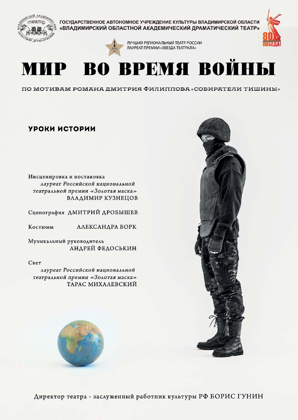Спектакли во Владимире Спектакль "Мир во время войны" (16+)04 марта 2026 в 18:00 По мотивам романа Дмитрия Филиппова "Собиратели тишины" Премьера спектакля состоялась 11 сентября 2025 года Cпектакль создан на средства гранта Министерства культуры РФ «У каждой войны, когда решается судьба народа и страны, должны быть свои песни и книги. В них поют и рассказывают, за что воевать и умирать, почему наше дело правое, а враг будет разбит… И горе тем воюющим, у кого не находится своего поэта и певца. Значит, с их духом и ощущением своей правоты что-то явно не так!» (Юрий Пущаев) Роман «Собиратели тишины» 43-летнего петербургского писателя Дмитрия Филиппова, участника СВО, написан им в 2024 году, прямо там - на передовой, между боями, когда каждая новая глава, каждая недописанная строка могла оказаться последней. Роман удостоен Национальной литературной премии «Слово» в номинации «Мастер. Проза». Создателям и участникам спектакля суждено не менее пронзительно, просто и искренне рассказать о сегодняшних военных днях и ночах, о воинском братстве, о любви и ожидании жён, матерей, об ужасах этой войны, страхах, боли, потерях, о цинизме ушлых чиновников (чего уж греха таить!) и о том, как непоколебимо свята и почитаема «такая профессия - Родину защищать»... ...Мы вернёмся живыми, не надо нас хоронить. Опалённые солнцем, отложим усталый свой меч.И Азовское море по-русски нас будет любить, И донецкая степь по-русски нас будет беречь. Мы вернёмся с Победой, прорвёмся сквозь толщу веков, Устоим под огнём и давленьем смертельного груза. А пока мы уходим дорогой наших отцов В направлении солнца, сквозь заросли кукурузы... Длительность спектакля 1 ч. 30 мин. (без антракта) Билеты по ссылке: https://vladimir.kassy.ru/events/teatr/2-2308/ https://vladimirkoncert.ru/shows/event/10546-Mir-vo-vremya-voiny Действует Пушкинская карта Дата: 04 марта 2026 Начало: в 18.00 Место проведения: Владимирский академический театр драмы, большая сцена Адрес: г. Владимир, ул. Дворянская, д. 4 Информация с https://dramavladimir.ru/repertoire/current/4761-peaceduringthewar « вернуться владимирская афиша другие спектакли во Владимире |