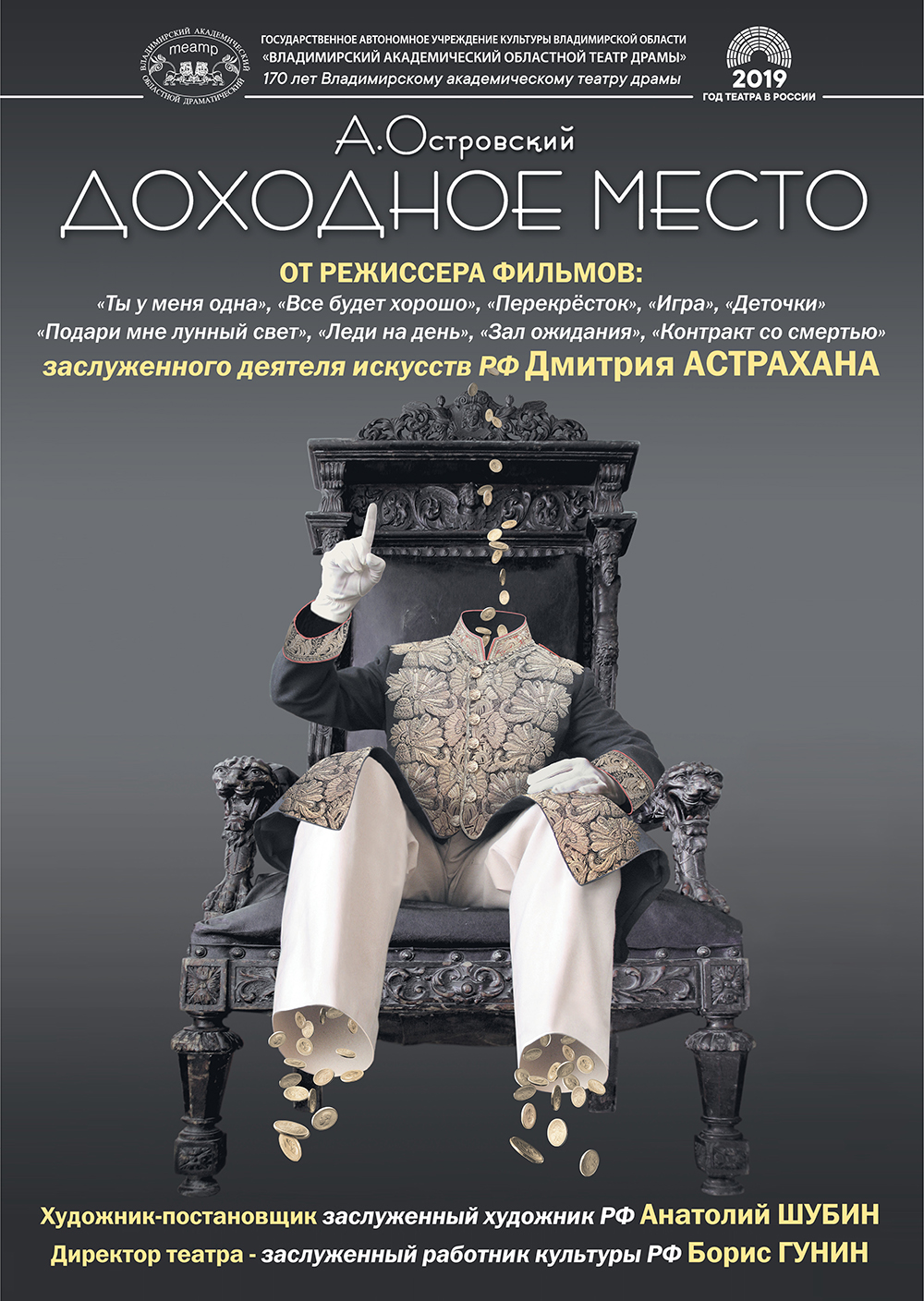 Спектакли во Владимире Спектакль "Доходное место" (14+)23 апреля 2026 в 18:00 Комедия в двух действиях Автор: А. Н. Островский Премьера состоялась 1 марта 2019 года Участие спектакля в фестивалях: – участник Театрального фестиваля "Вперёд к Островскому" (г. Санкт-Петербург, 2021 г.) 21 ноября 2020 года спектакль "Доходное место" был показан на канале ОТР общественное российское телевидение. – участник VI Международного театрального фестиваля русской классической драматургии "Горячее сердце" (г. Кинешма, 2023 г.). Cпециальными дипломами фестиваля награждены артисты Владимирского академического театра драмы Галина Фатхутдинова за роль Фелисаты Кукушкиной и Анатолий Шалухин за роль Онисима Белогубова. – участник ХI международного театрального фестиваля "Золотая провинция" (г. Новокузнецк, 2023 г.). Cпециальными дипломами фестиваля награждены артисты Владимирского академического театра драмы Галина Фатхутдинова за роль Фелисаты Кукушкиной и Анатолий Шалухин за роль Онисима Белогубова. – участник IX Международного театрального фестиваля "Русская классика" (г. Орел, 2023 г.) Специальными дипломами фестиваля награждены артисты Владимирского академического театра драмы народный артист РФ, лауреат Национальной премии "Золотая маска", премии Правительства РФ им Ф. Волкова, областной премии им. Е. Евстигнеева Николай Горохов за роль Юсова, Галина Фатхутдинова за роль Фелисаты Кукушкиной и Анатолий Шалухин за роль Онисима Белогубова. За лучшую режиссуру спектакля – заслуженный деятель искусств РФ Дмитрий Астрахан. – участник юбилейных гастролей Владимирского академического театра драмы в Санкт-Петербурге на сцене Государственного молодежного театра на Фонтанке (ноябрь, 2023 г.) – участник XVII Межрегионального театрального фестиваля имени Н.Х. Рыбакова (г. Тамбов, 2024г.) Премия в номинации "Актер России" присуждена артисту Александру Аладышеву за роль Жадова. – участник гастролей в Беларуси (г. Могилев, апрель, 2025 г.) - участник гастролей в Ялте, Симферополе и Луганске (2025г.) Дмитрий Астрахан, режиссер со всемирной известностью, по-новому взглянул на классические тексты. Нестареющая классика на сцене одного из самых старых театров страны. Этот спектакль рассказывает о падении нравов, о том, как принципы меркнут перед любовью и нищетой, о том, что за каждым углом могут ждать разительные перемены. Одному из героев все же повезло. Повезло в том, что перед самым падением, перед самым предательством самого себя вмешались обстоятельства и помогли ему. Так может, это значит, что еще не все потеряно? Может быть, мы еще в силах что-то изменить? Длительность спектакля 3 ч. 10 мин. (1 акт - 1 ч. 35 мин.) Билеты по ссылке: https://vladimir.kassy.ru/events/teatr/2-2337/ https://vladimirkoncert.ru/shows/event/10749-Dokhodnoe-mesto Действует Пушкинская карта Дата: 23 апреля 2026 Начало: в 18.00 Место проведения: Владимирский академический театр драмы, большая сцена Адрес: г. Владимир, ул. Дворянская, д. 4 Информация с https://www.dramavladimir.ru/playbill#aprel « вернуться владимирская афиша другие спектакли во Владимире |
