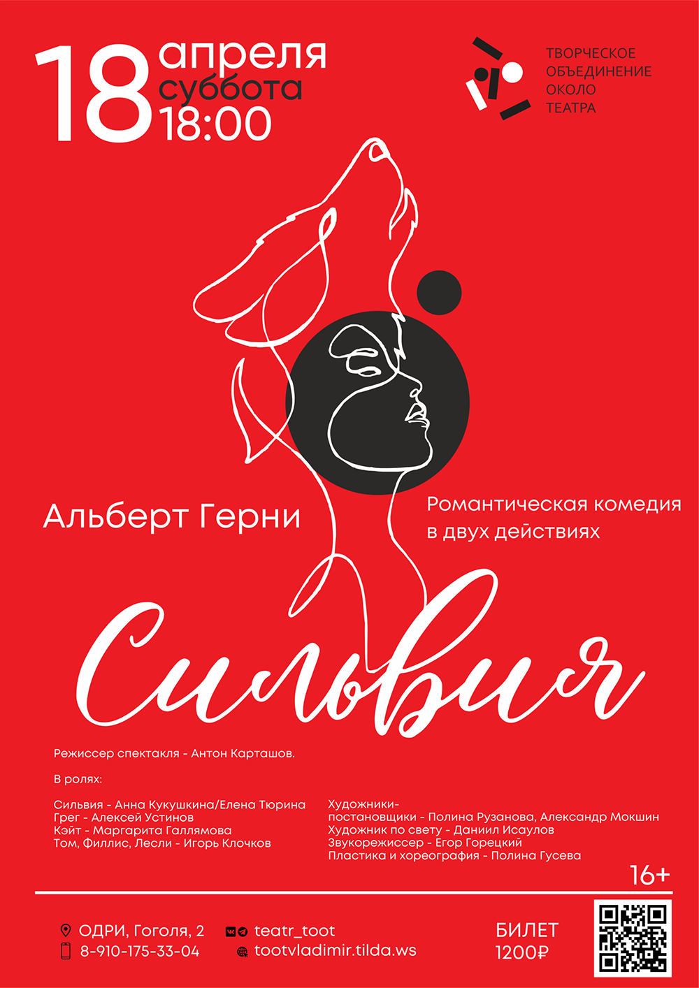 Спектакли во Владимире Спектакль «Сильвия»18 апреля 2026 в 18:00 Камерный театр Т.О.О.Т. Спектакль поставлен по пьесе писателя и драматурга Альберта Герни в переводе С.Таска. В центре сюжета – обычная семья, в которой однажды появляется… собака. Вместе с ней в дом неизбежно придет счастье. Но сначала героям придется преодолеть взаимные обиды, ревность и непонимание. У жизнерадостной Сильвии получается не просто вернуть супругам уходящее чувство любви, но и наполнить их жизни смыслом, избавить от одиночества, объяснить своим хозяевам, что же такое настоящее счастье. В ролях: Сильвия — Анна Кукушкина Грег — Алексей Устинов Кейт — Маргарита Галлямова Том, Лесли, Филис — Игорь Клочков Режиссер спектакля — Антон Карташов Цена билета: 1200 рублей. Действует Пушкинская карта Билеты в кассе ОДРИ и по ссылке: https://vk.cc/cVJwGJ Дата: 18 апреля 2026 Начало: в 18.00 Место проведения: Владимирский областной Дом работников искусств Адрес: г. Владимир, ул. Гоголя, 2 Информация с https://vladodri.ru/events/spektakl-silvija-7/ « вернуться владимирская афиша другие спектакли во Владимире |