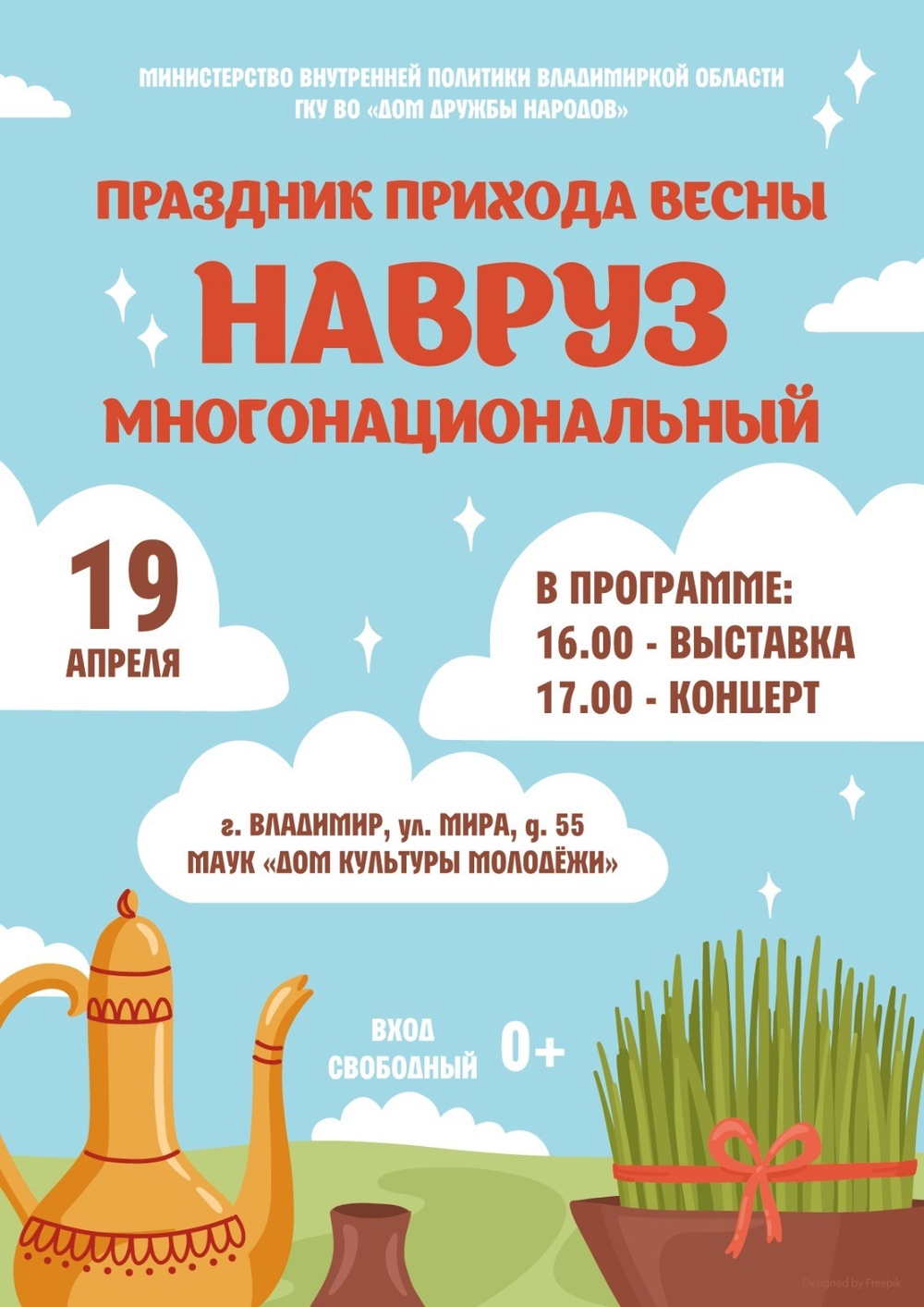 События во ВладимиреМероприятияПраздник прихода весны "Навруз"Опубликовано: 07 апреля 2025 19 апреля 2025 года в 16.00 в Доме культуры молодежи ![]() Дорогие друзья! Приглашаем вас 19 апреля 2025 года в 16.00 в Дом культуры молодежи по адресу: г. Владимир, ул. Мира, д. 55 на многонациональное мероприятие, посвященное одному из самых главных праздников восточных народов — Наврузу! Гости нашего мероприятия смогут поближе познакомиться с народами, проживающими на территории Владимирской области и приобщиться к культурным традициям Востока на интересной, яркой и самобытной выставке, которая начнет свою работу в фойе Дома культуры молодежи в 16.00. В 17.00 на сцене ДКМ начнется концертная программа «Праздник прихода весны - Навруз многонациональный», которую украсят выступления творческих коллективов и исполнителей национально-культурных объединений региона, а также специальных гостей из Москвы. Национальную культуру и обычаи продемонстрируют: татары, чеченцы, узбеки, таджики и, конечно, русские. Ждем всех жителей и гостей города Владимира 19 апреля в Доме культуры молодёжи с 16.00 на «Празднике прихода Весны – Наврузе многонациональном»! Вход свободный. Информация с https://vk.com/wall-216822927_10350 |
