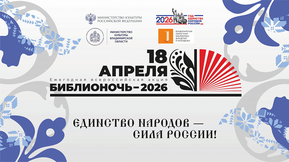 События во ВладимиреАкцияВсероссийская просветительская акция «Библионочь – 2026»Опубликовано: 12 апреля 2026 18 апреля 2026 года в Областной библиотеке для детей и молодежи ![]() 18 апреля ежегодная акция «Библионочь» в 2026 году пройдет в России уже в 15-й раз. Тема акции в этом году — «Единство народов — сила России!» Владимирская областная библиотека для детей и молодёжи традиционно проведет «Библиосумерки» в детском корпусе на ул. Мира, 51 для юных читателей и их родителей и «Библионочь» - в молодёжном корпусе на пр. Строителей, 23. Обратите внимание, что на некоторые события потребуется предварительная запись! Афиша мероприятий ул. Мира 51 по ссылке: https://detmobib.ru/news/4652/ Афиша мероприятий пр-т Строителей 23 по ссылке: https://detmobib.ru/news/4661/ Информация с https://detmobib.ru/news/ |