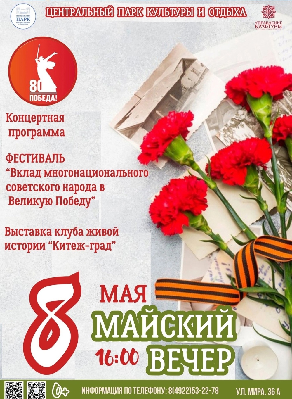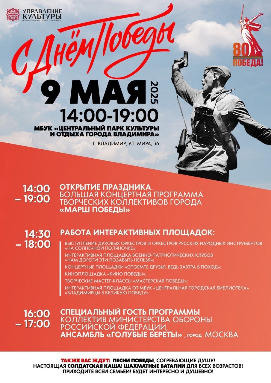 События во ВладимиреЦентральный парк культуры и отдыха → Развлекательная программа "День рождения Деда Мороза"![]() 16 ноября в Центральном парке культуры и отдыха г. Владимир Центральный парк культуры и отдыха → Праздничная программа "Под знаком мира, дружбы и добра"![]() 4 ноября 2025 с 12.00 в Центральном парке культуры и отдыха г. Владимира Центральный парк культуры и отдыха → Праздничная программа "Город мой - мой Владимир"![]() 30 августа 2025 года с 12:00 в Центральном парке культуры и отдыха г. Владимира Центральный парк культуры и отдыха → "Праздник будущего первоклассника"![]() 23 августа 2025 года с 12.00 на в Центральном парке культуры и отдыха г.Владимира Центральный парк культуры и отдыха → День рождения Центрального парка![]() 3 августа 2025 года с 14.00 в Центральном парке культуры и отдыха г. Владимира Центральный парк культуры и отдыха → Семейный праздник «Дарите ромашки любимым»![]() 5 июля 2025 года с 12.00 в Центральном парке культуры и отдыха города Владимира Центральный парк культуры и отдыха → Этно-день «Вокруг света»![]() 29 июня 2025 года с 12.00 в Центральном парке культуры и отдыха г. Владимира Центральный парк культуры и отдыха → Закрытие фестиваля «Владимир – Белокаменная столица»![]() 28 июня 2025 года с 10.00 в Центральном парке Центральный парк культуры и отдыха → "День молодёжи – 2025"![]() 28 июня 2025 года С 16.30 в Центральном парке культуры и отдыха г. Владимира Центральный парк культуры и отдыха → Творческая встреча с Александром Шагановым![]() 14 июня 2025 в 15.00 в Центральном парке культуры и отдыха Центральный парк культуры и отдыха → Праздничная программа "Моя любовь - моя Россия"![]() 12 июня 2025 года с 12.00 в Центральном парке культуры и отдыха г. Владимира Центральный парк культуры и отдыха → Международный фестиваль «Владимир – Белокаменная столица»![]() С 01 июня по 12 июля в Центральном парке культуры и отдыха г. Владимира Центральный парк культуры и отдыха → Детский праздник «Планета детства под созвездием семья»![]() 01 июня с 11.00 в Центральном парке культуры и отдыха г.Владимира Центральный парк культуры и отдыха → Музыкальный фестиваль «Ритмы весны»![]() 17 мая 2025 года с 15.00 в Центральном парке культуры и отдыха г. Владимира Центральный парк культуры и отдыха → "С Днем Победы"![]() 9 мая 2025 года с 14.00 в Центральном парке культур и отдыха г. Владимир Центральный парк культуры и отдыха → Концертная программа «Майский вечер»![]() 8 мая 2025 года с 16.00 в Центральном парке культур и отдыха г. Владимира Центральный парк культуры и отдыха → Праздничная программа «Ностальгия. Первомайский фестиваль»![]() 1 мая 2025 года с 12.00 в Центральном парке культуры и отдыха г. Владимира Центральный парк культуры и отдыха → Праздничная программа «Разноцветный Первомай»![]() 1 мая 2025 года с 12.00 в парке культуры и отдыха «Добросельский» Центральный парк культуры и отдыха → "Царская Масленица"![]() 02 марта с 12.00 в Центральном парке культуры и отдыха г. Владмира Центральный парк культуры и отдыха → Тематическая программа «Мужество, доблесть и честь»![]() 23 февраля 2025 года с 12.00 в Центральном парке культуры и отдыха г. Владимира [1] [2] [3] Всего: 74 |